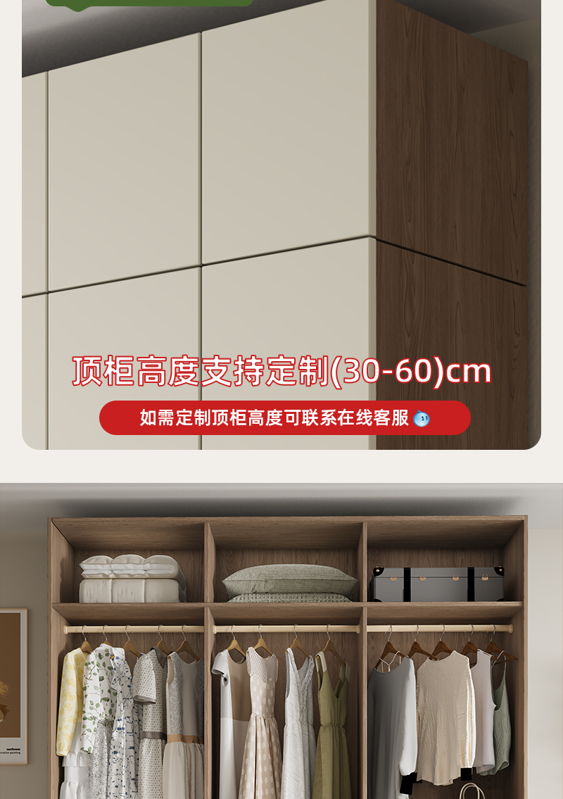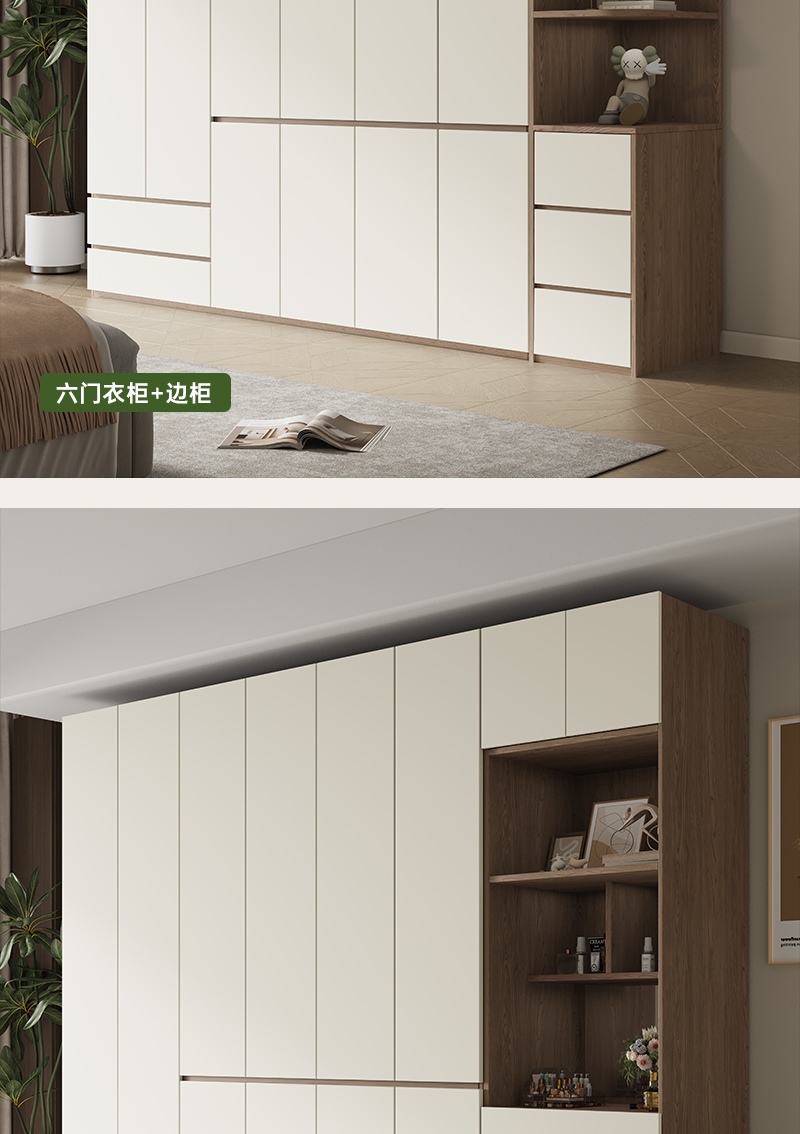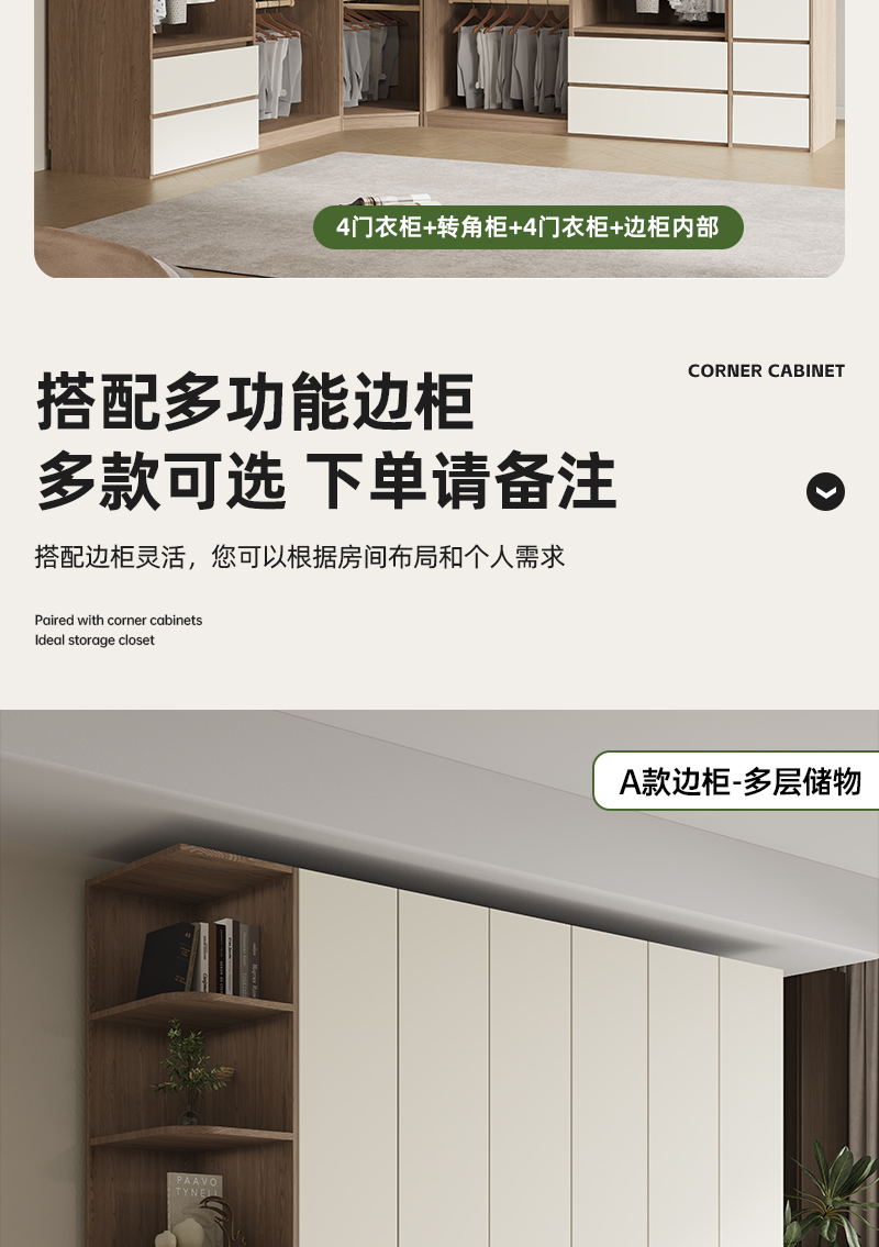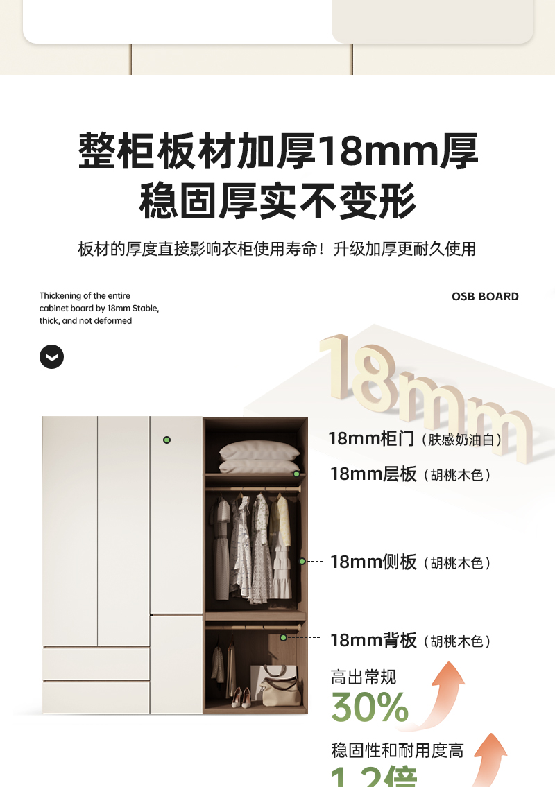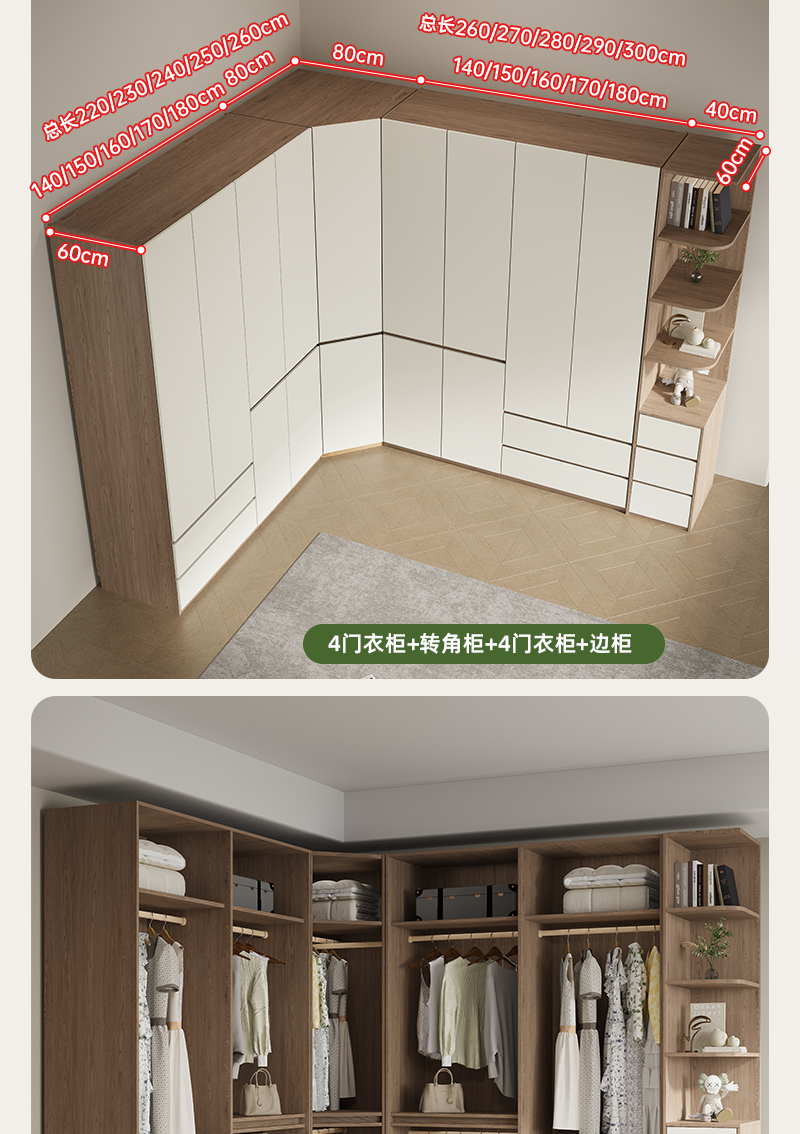 分段衣柜奶油白肤感门18mm厚胡桃色柜体L形转角组合收纳家用卧室