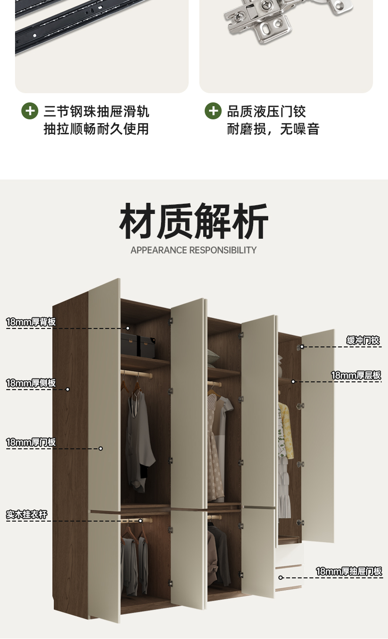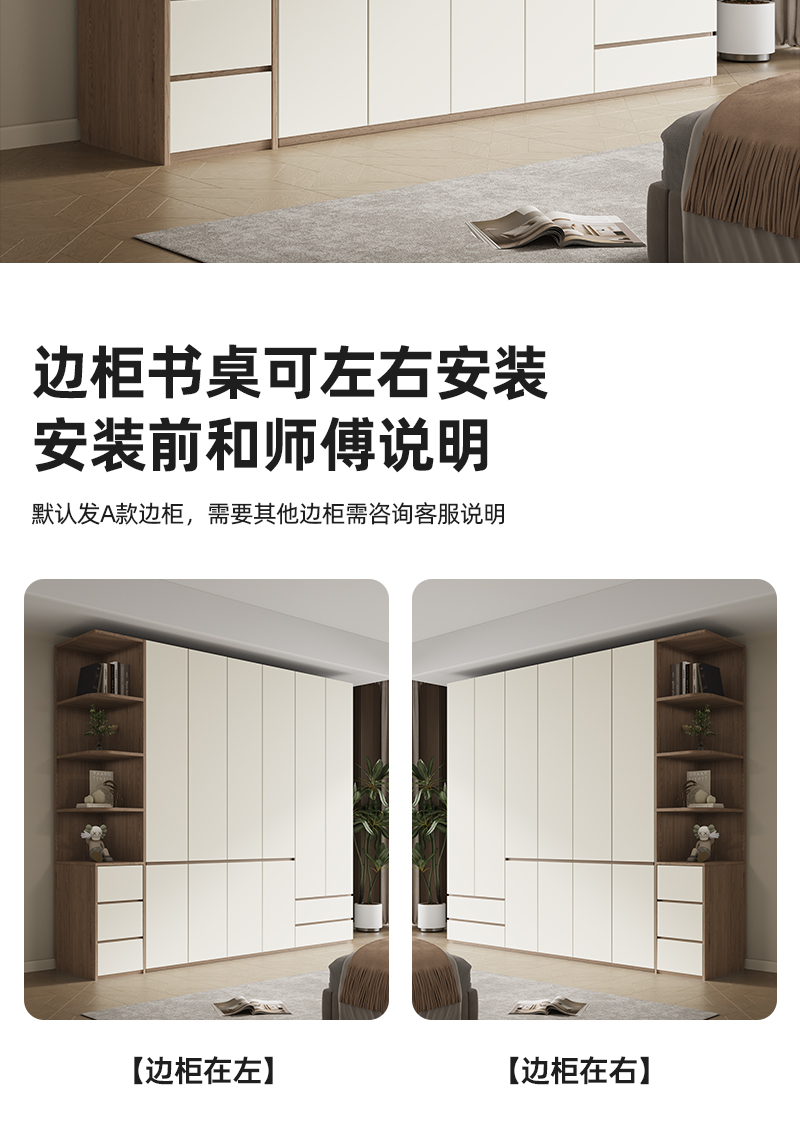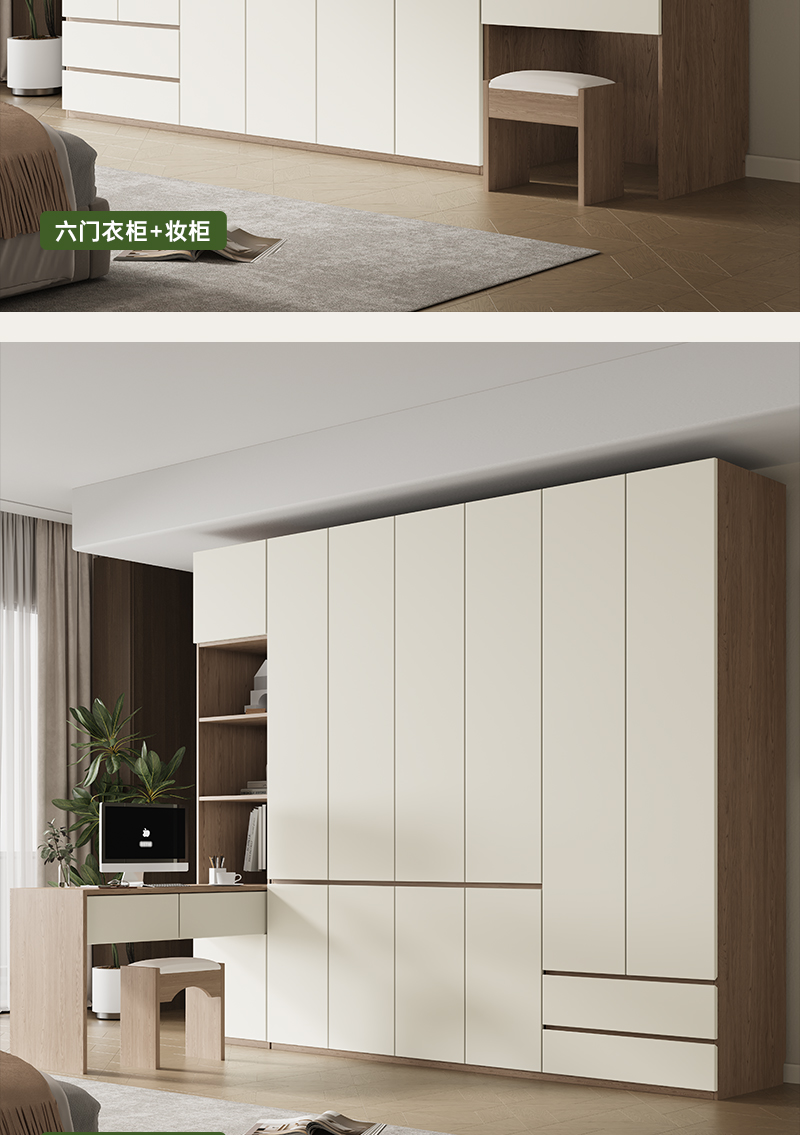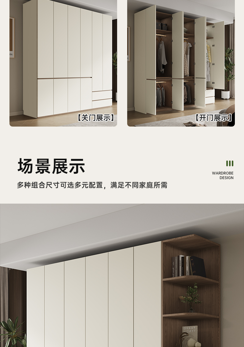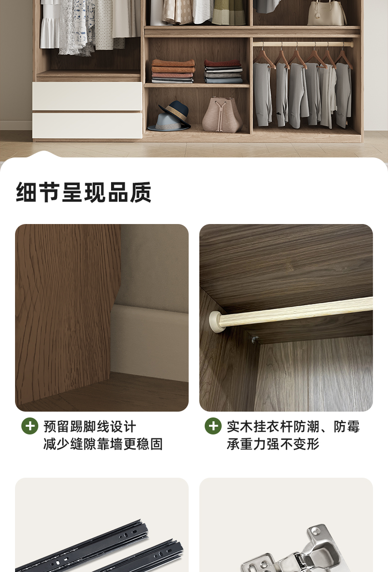 分段衣柜奶油白肤感门18mm厚胡桃色柜体L形转角组合收纳家用卧室