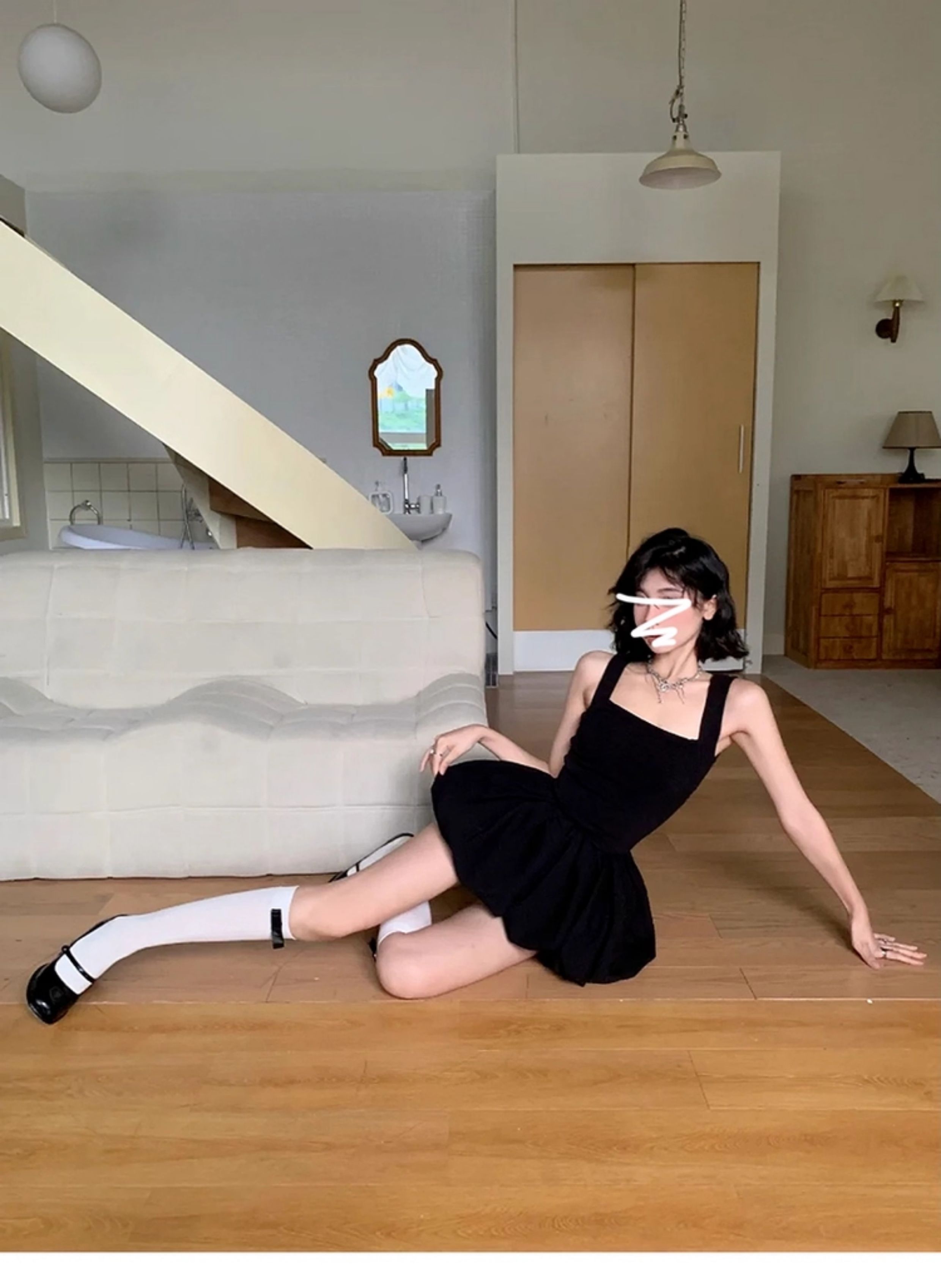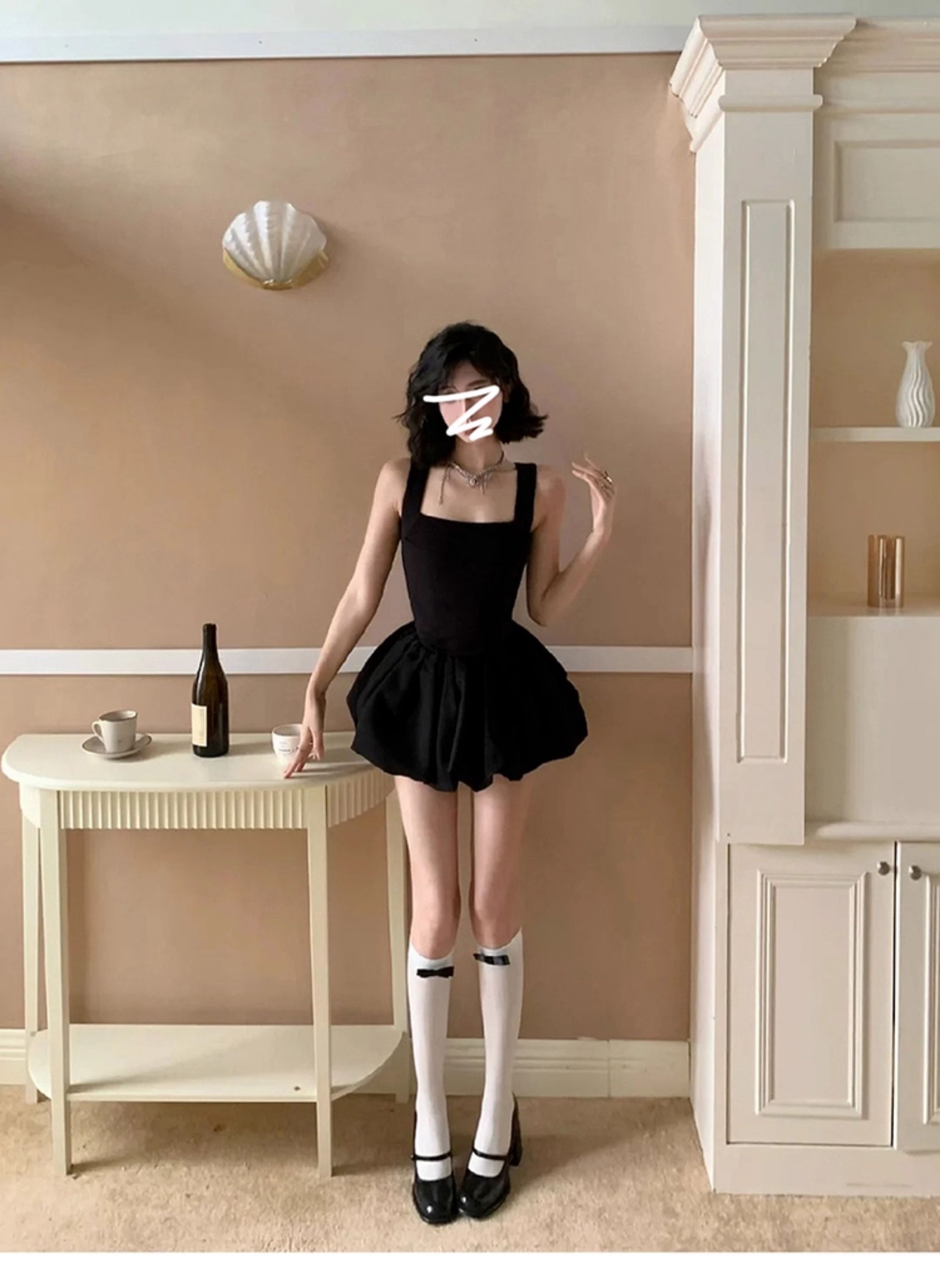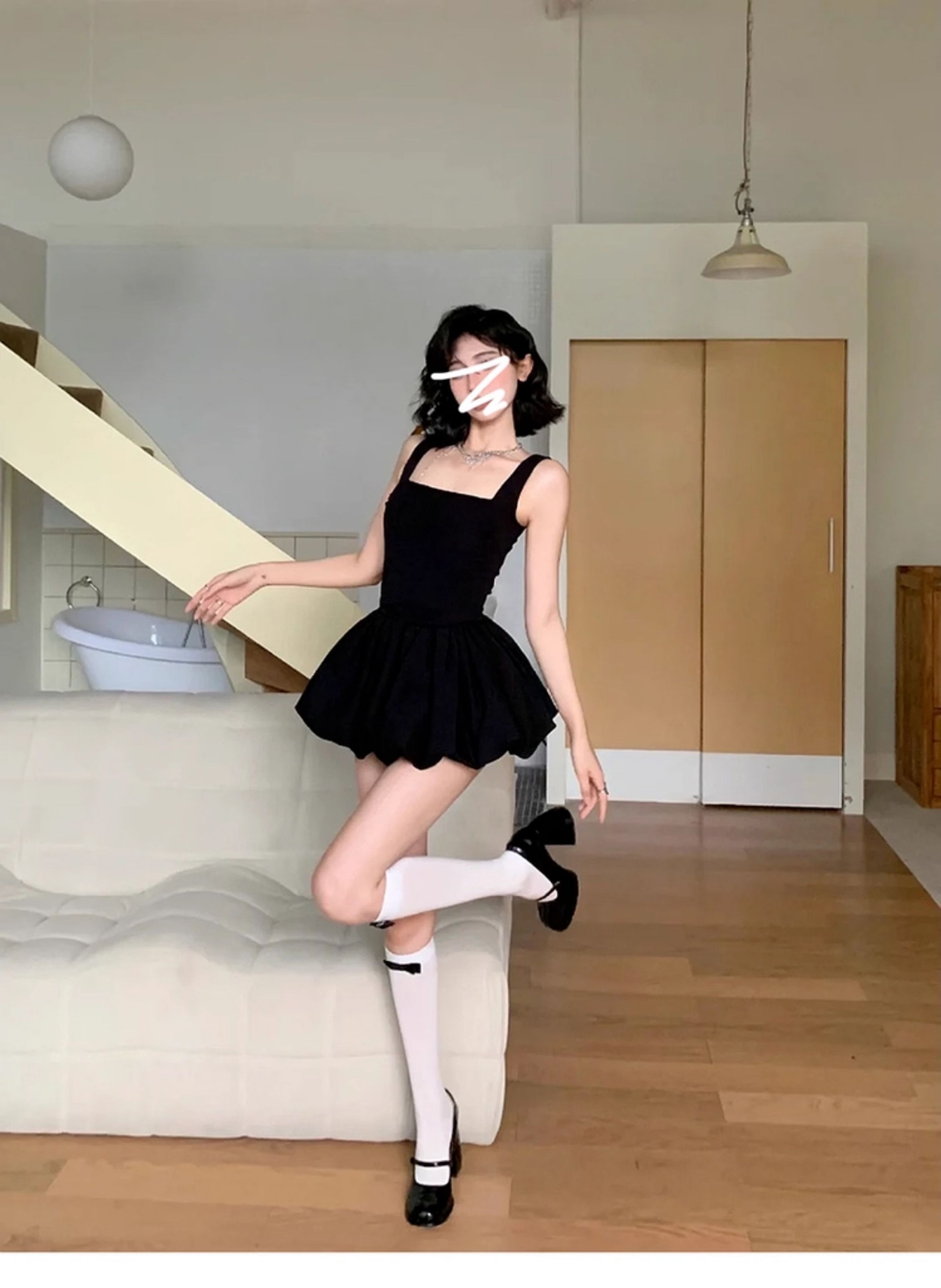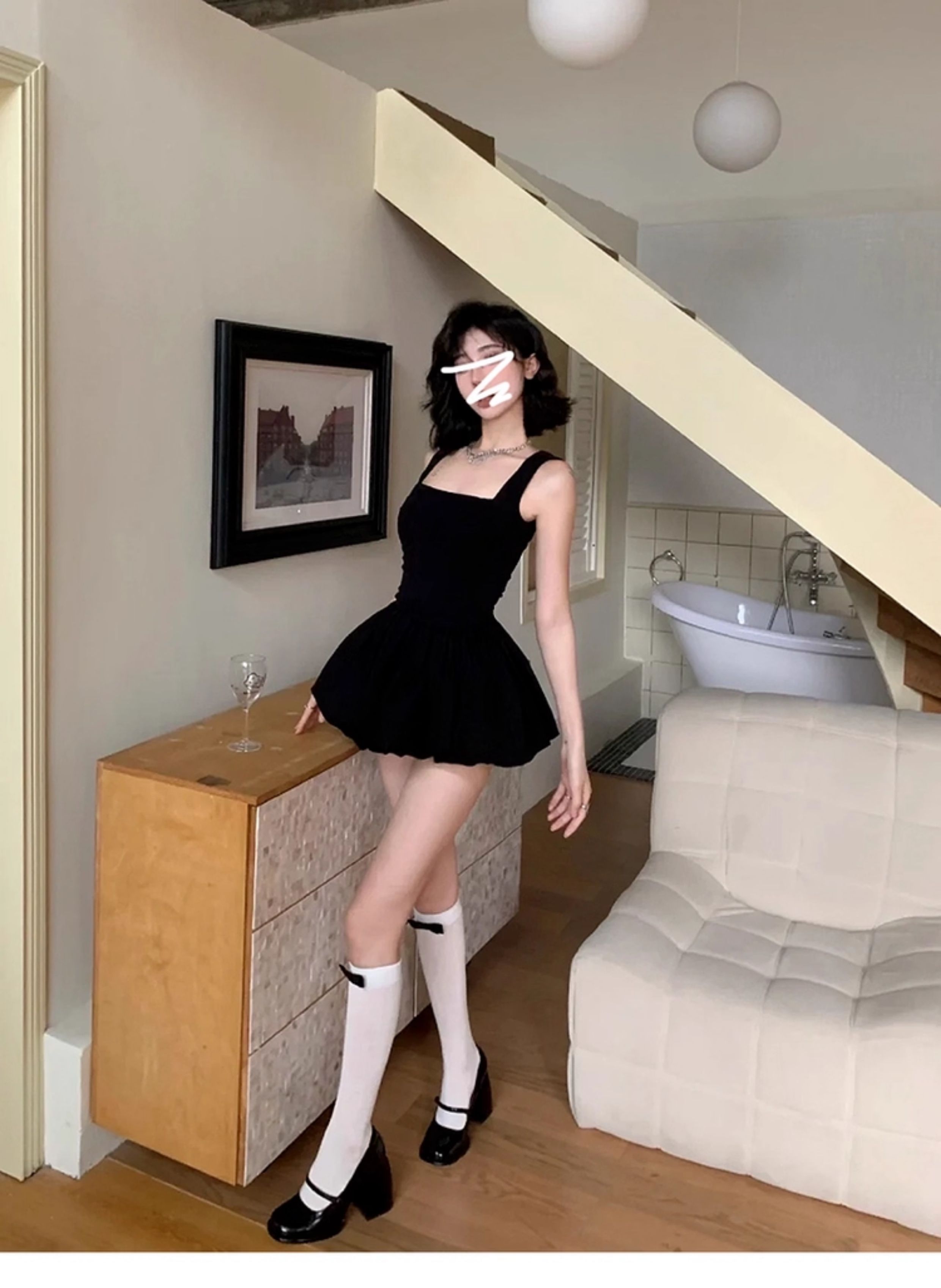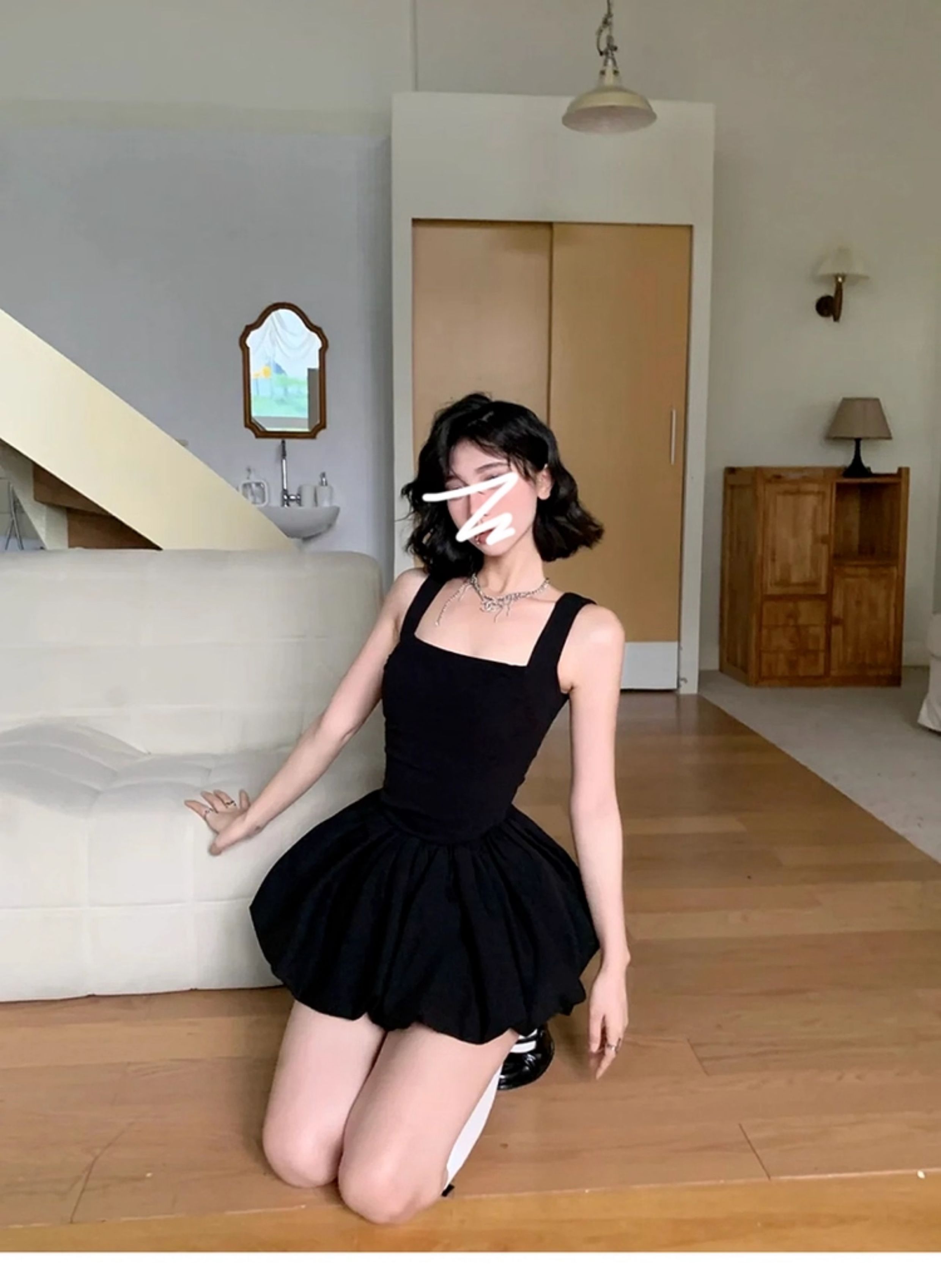 2025新款黑色无袖吊带连衣裙子女初夏小个子法式甜辣芭蕾蓬蓬短裙