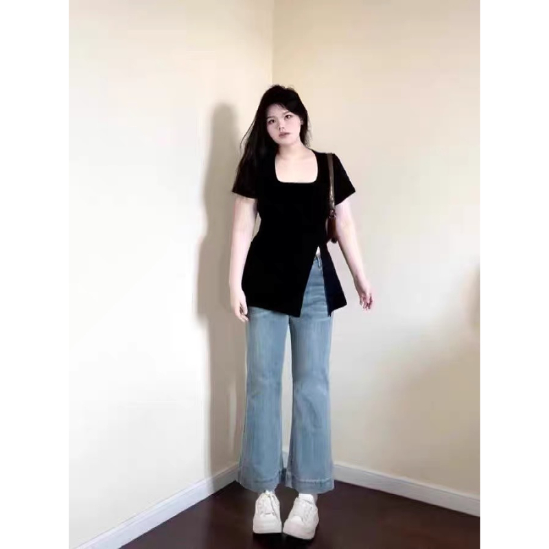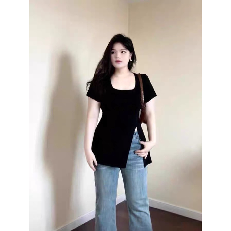 大码胖mm设计感开叉方领短袖t恤女夏季新款收腰显瘦韩系小上衣潮
