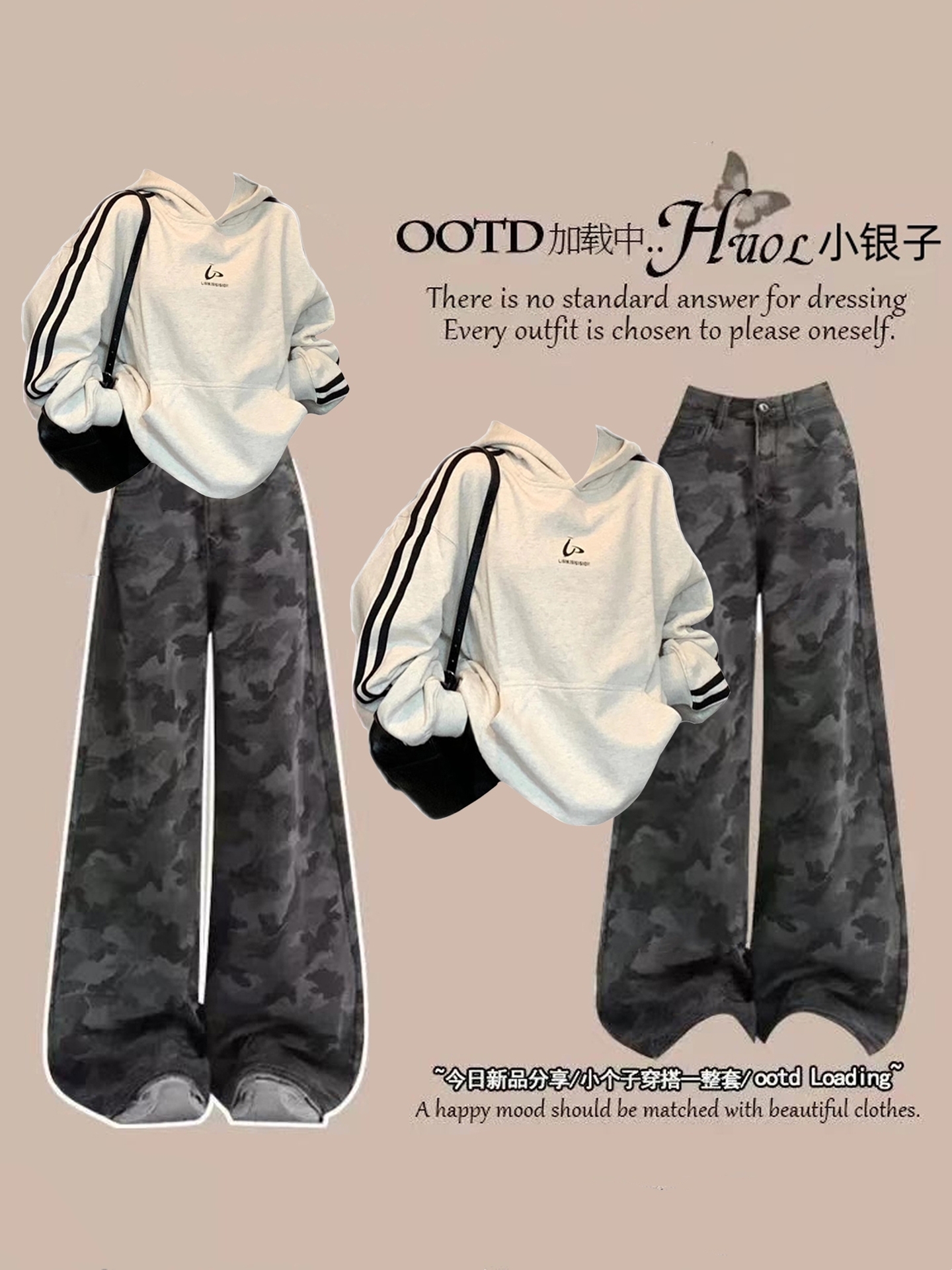 学院风搭配一整套秋装韩系穿搭连帽卫衣女高腰迷彩牛仔裤两件套潮
