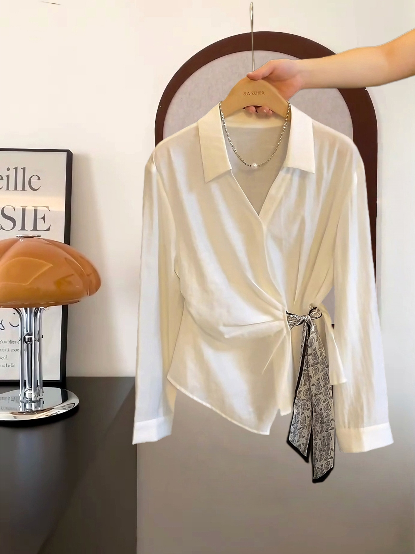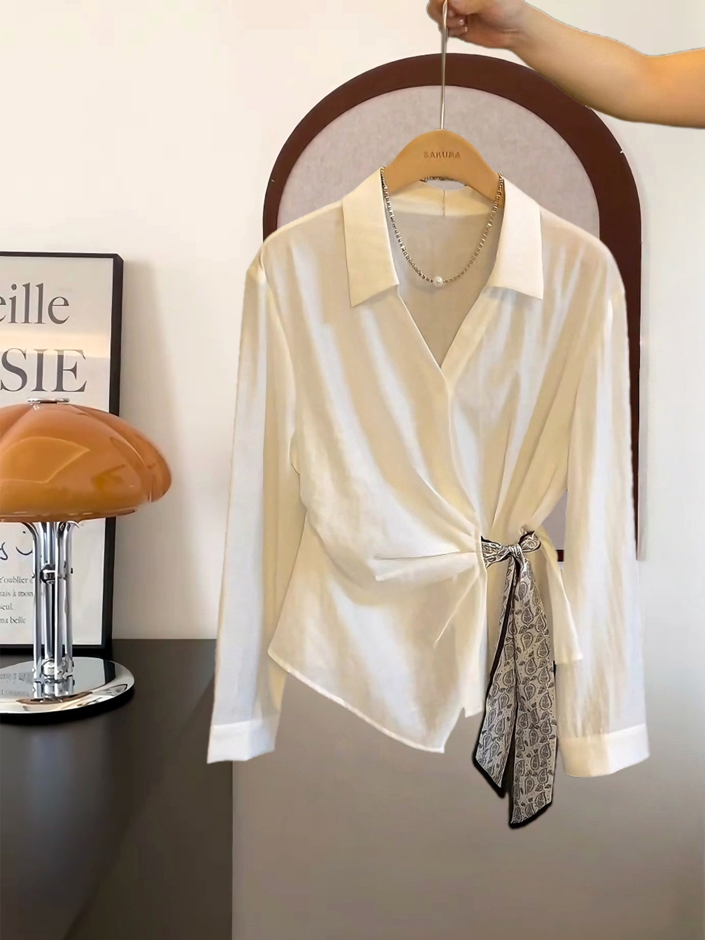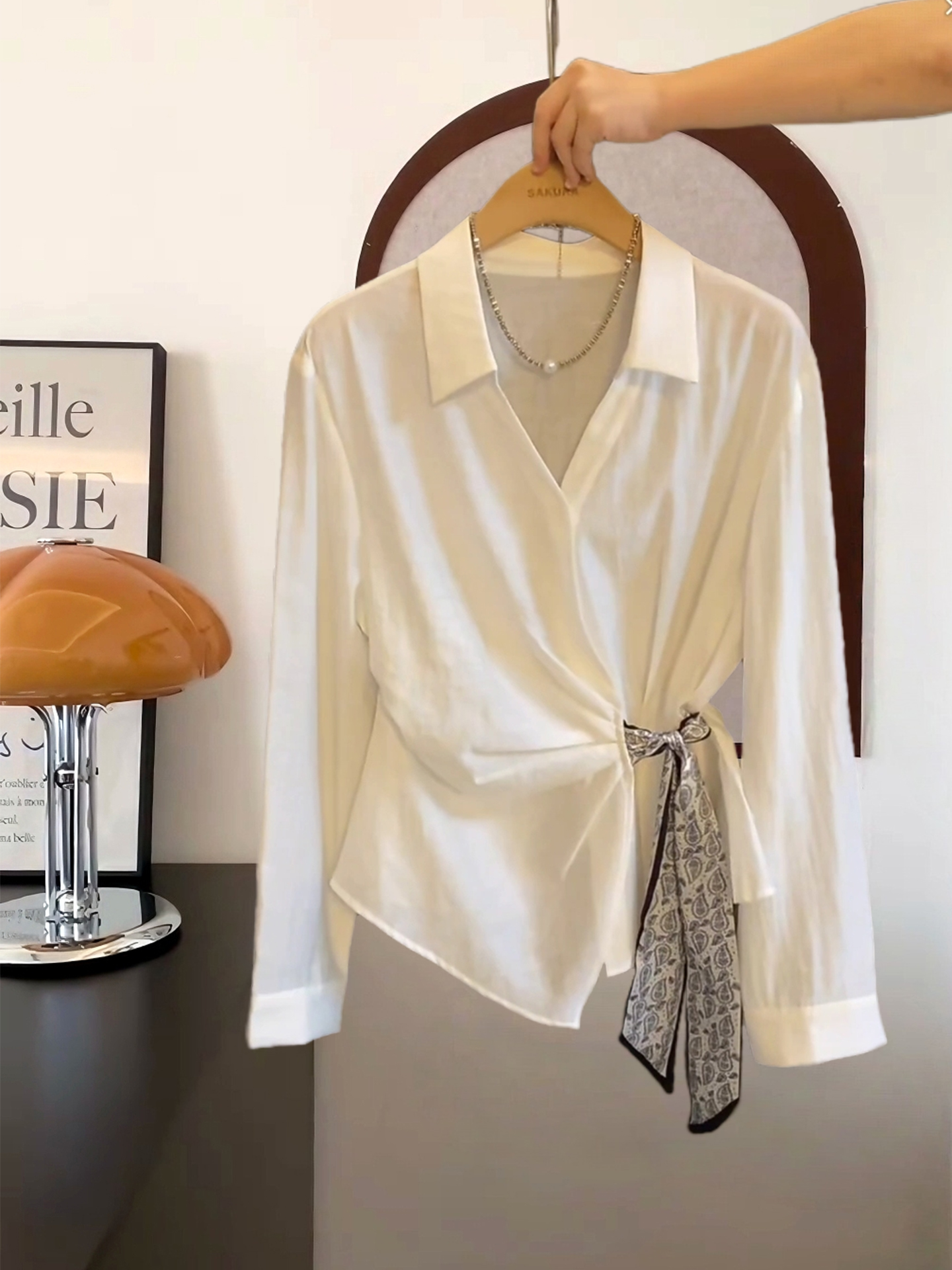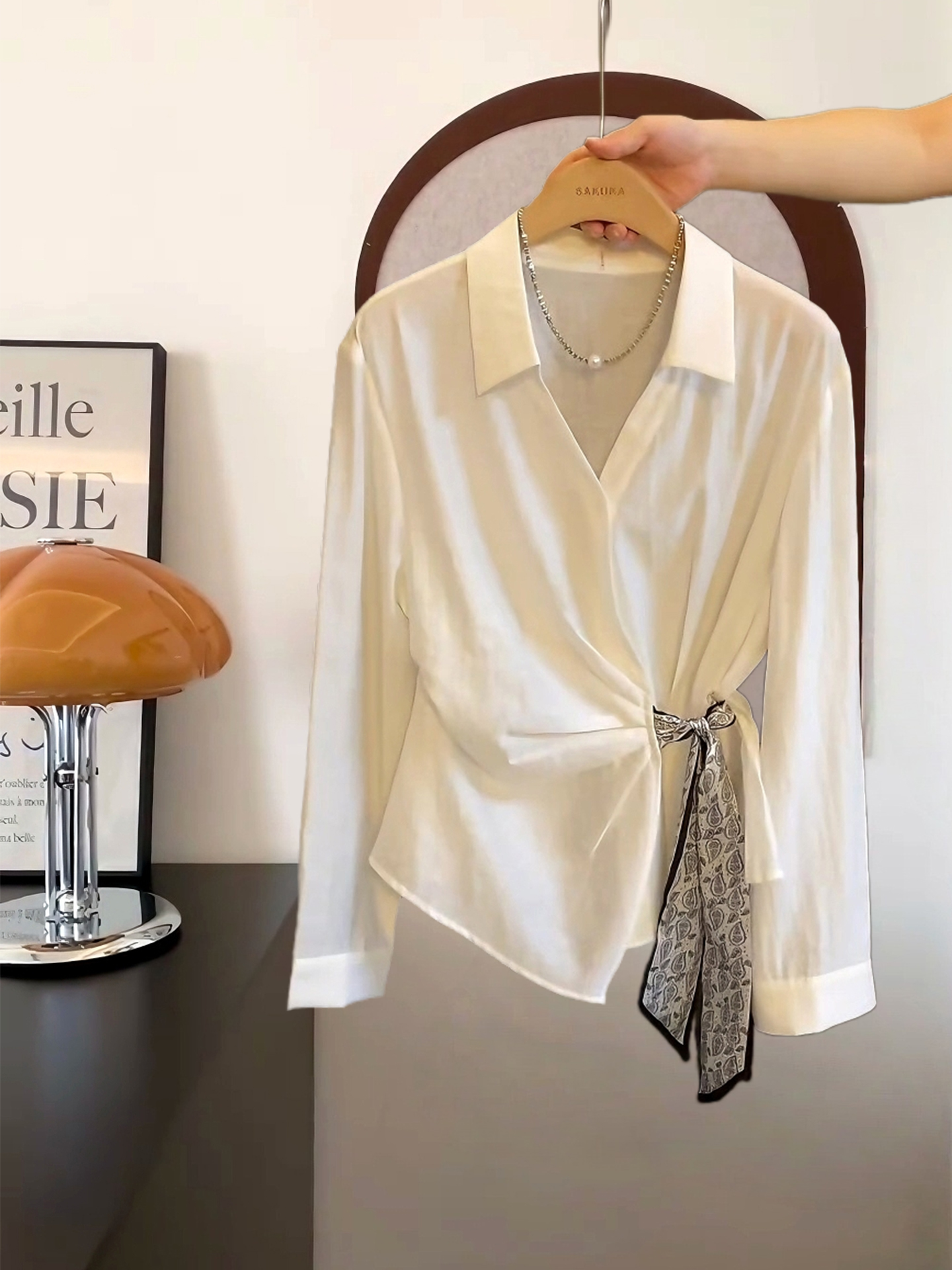 法式气质轻熟风丝巾绑带收腰衬衫女秋季时尚高级别致V领长袖上衣