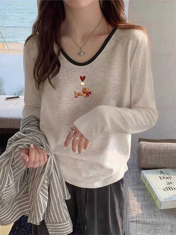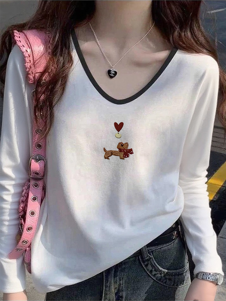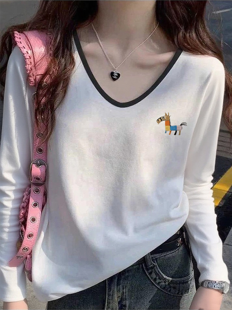 正肩纯棉拼色V领长袖t恤女士打底衫时尚百搭浅花灰色上衣春秋冬季