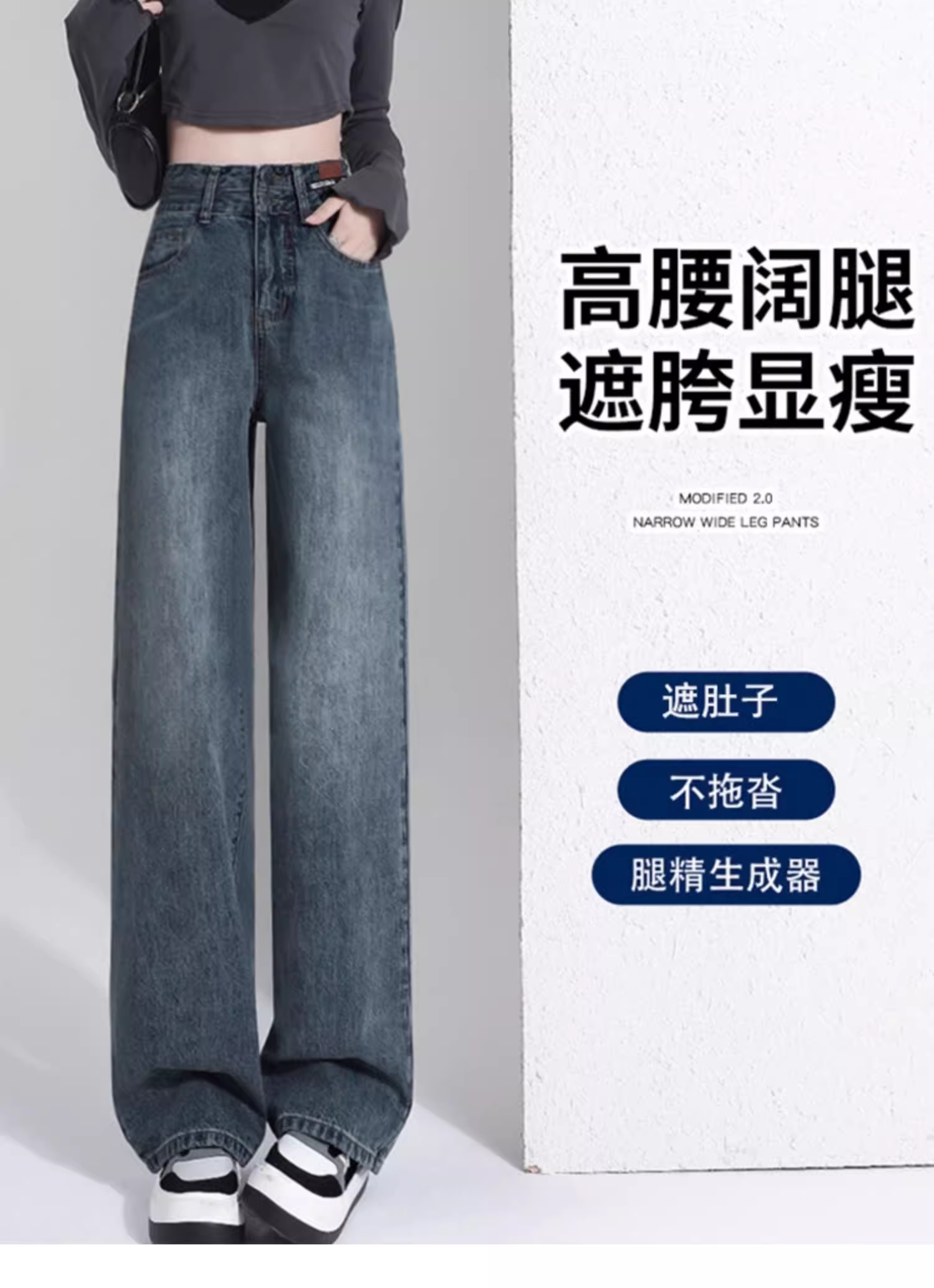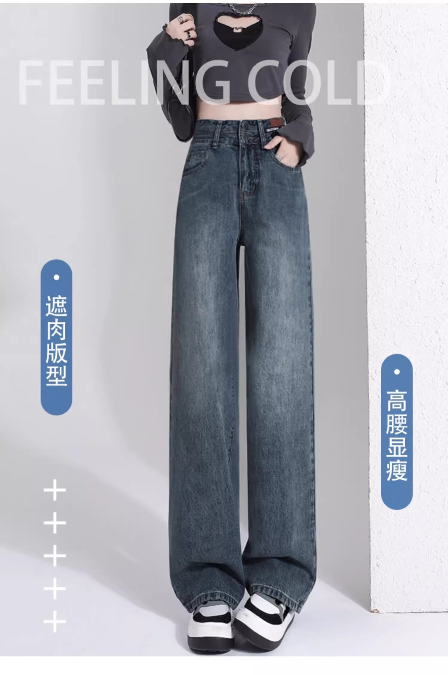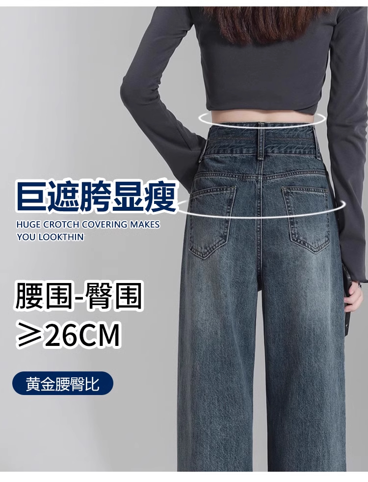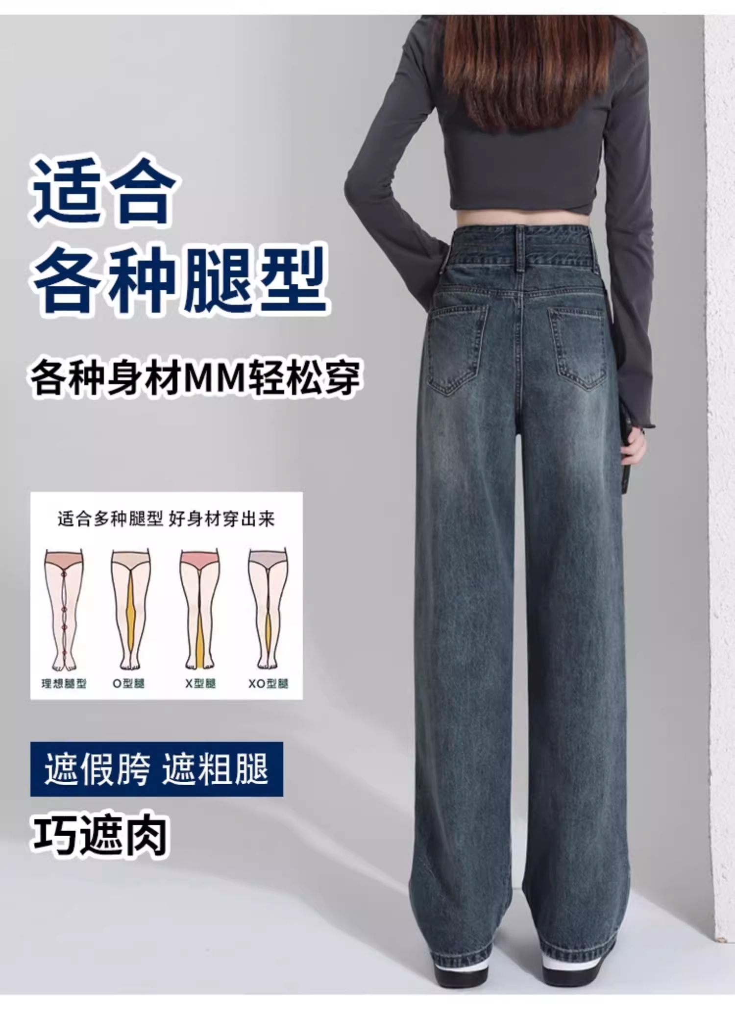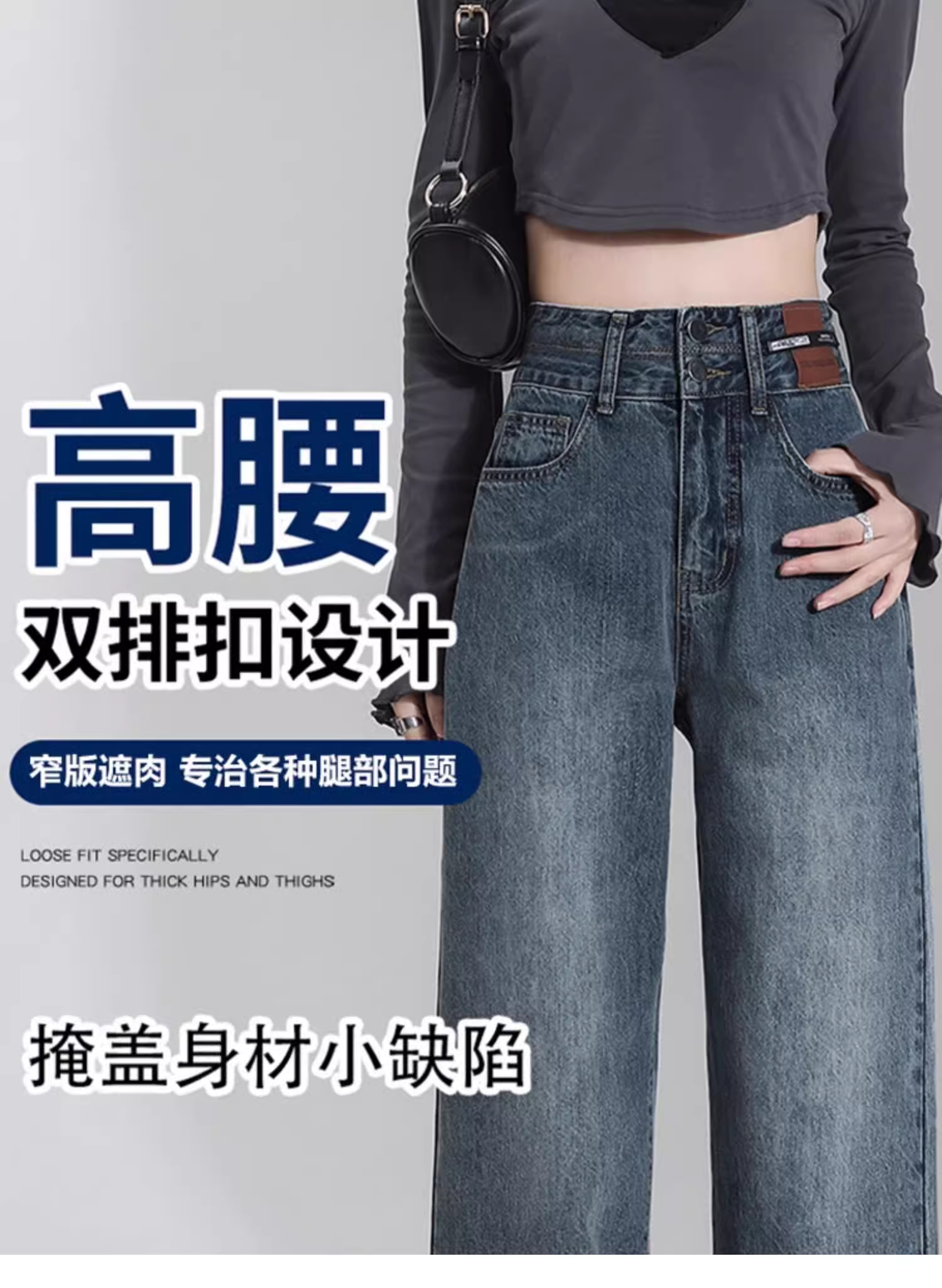 遮胯高腰阔腿牛仔裤女春秋2025新款粗腿宽胯显瘦复古窄版直筒裤子
