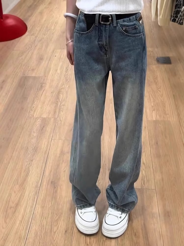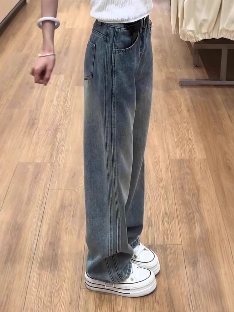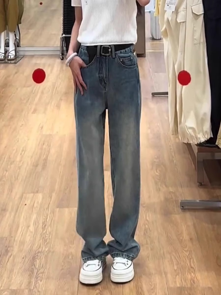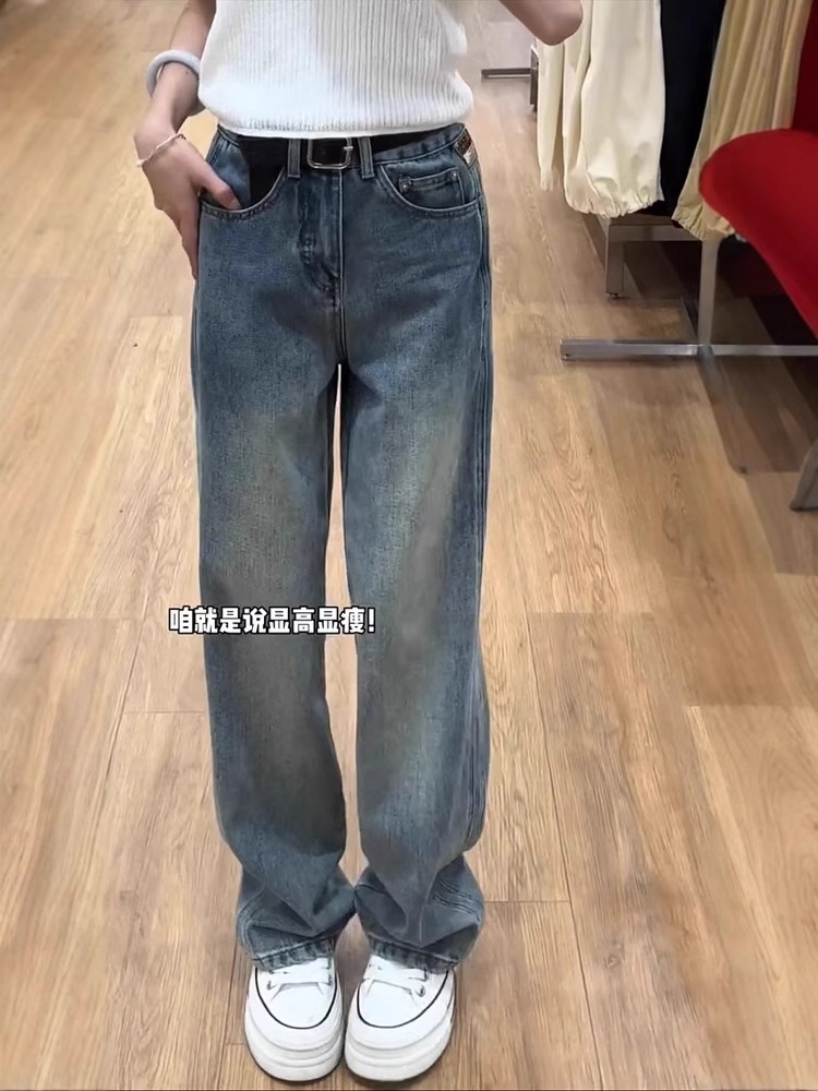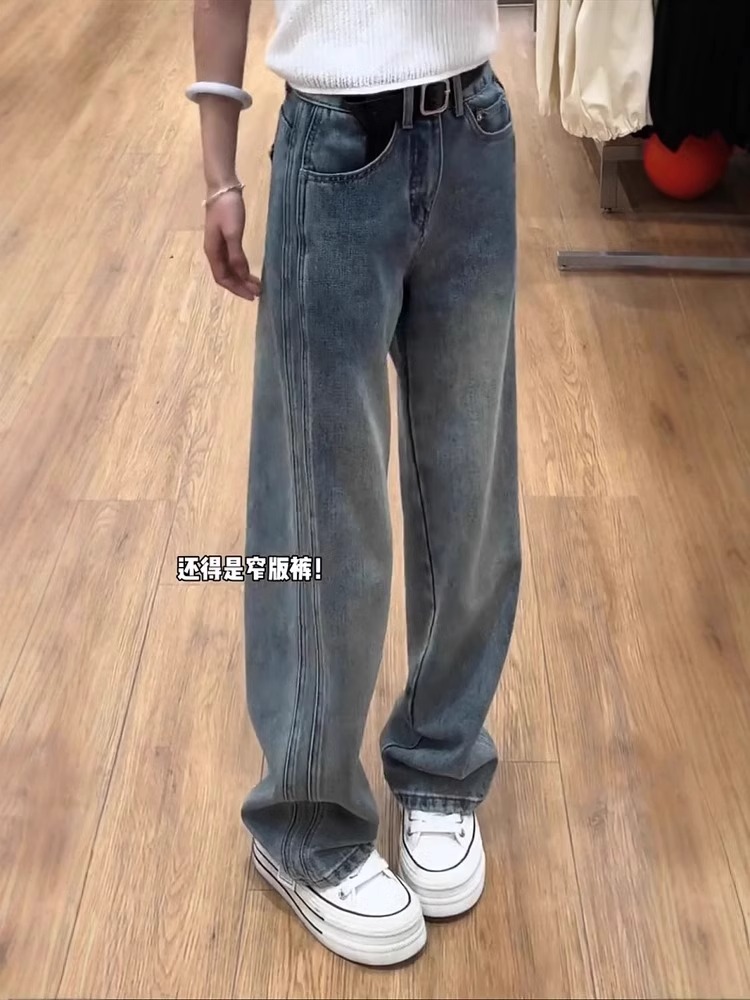 复古窄版直筒牛仔裤女秋季新款大码胖mm梨形身材高腰显瘦阔腿裤子