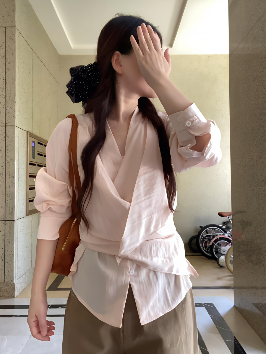 法式藕粉色交叉绑带收腰长袖衬衫女装早秋温柔风气质修身绝美上衣