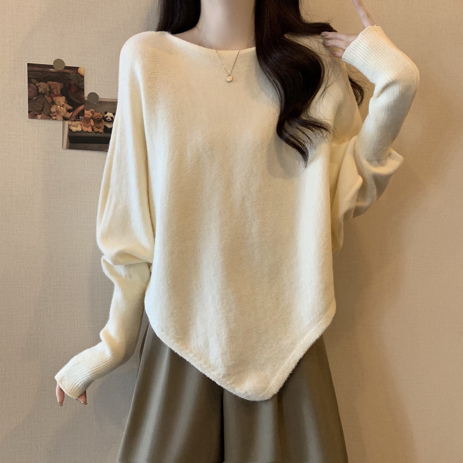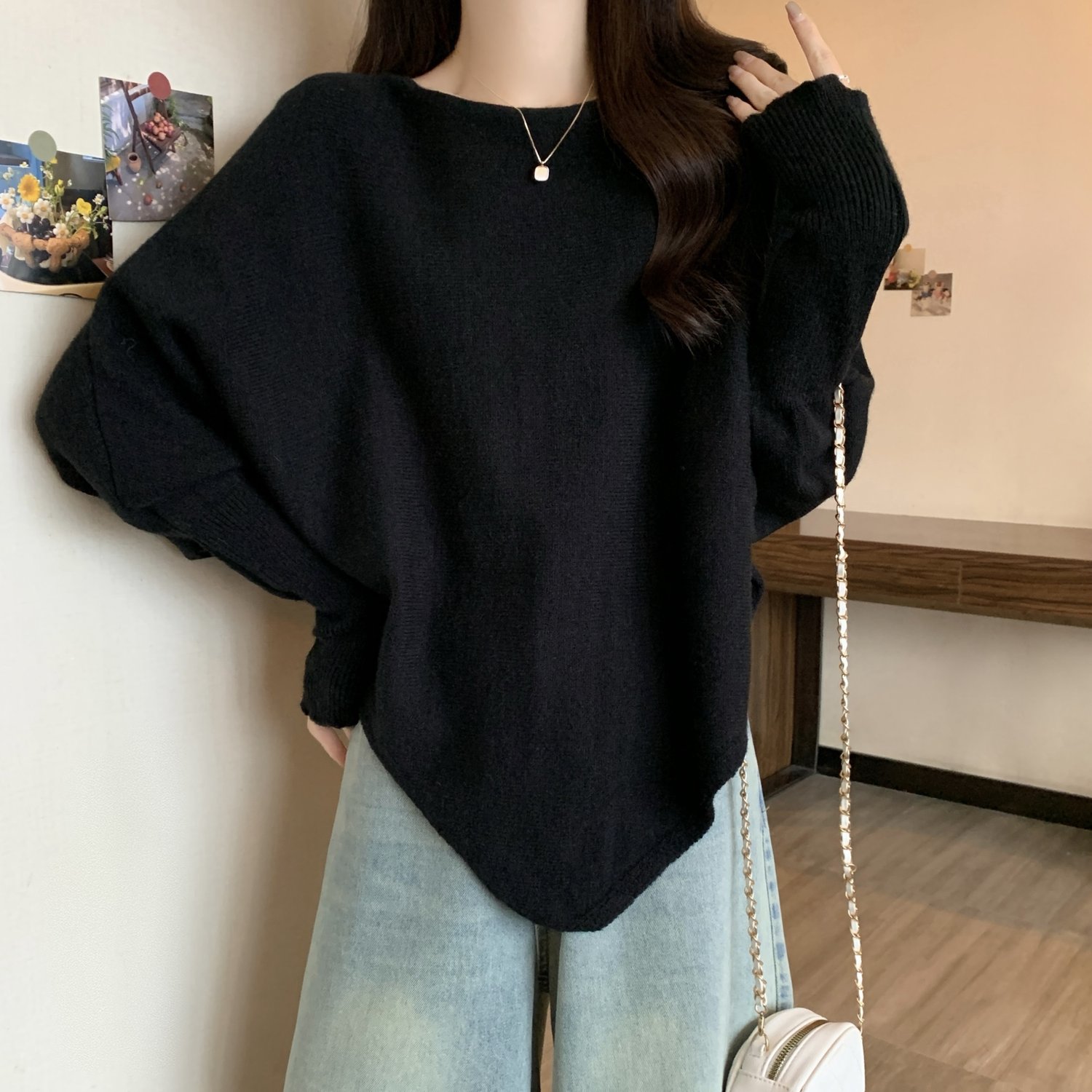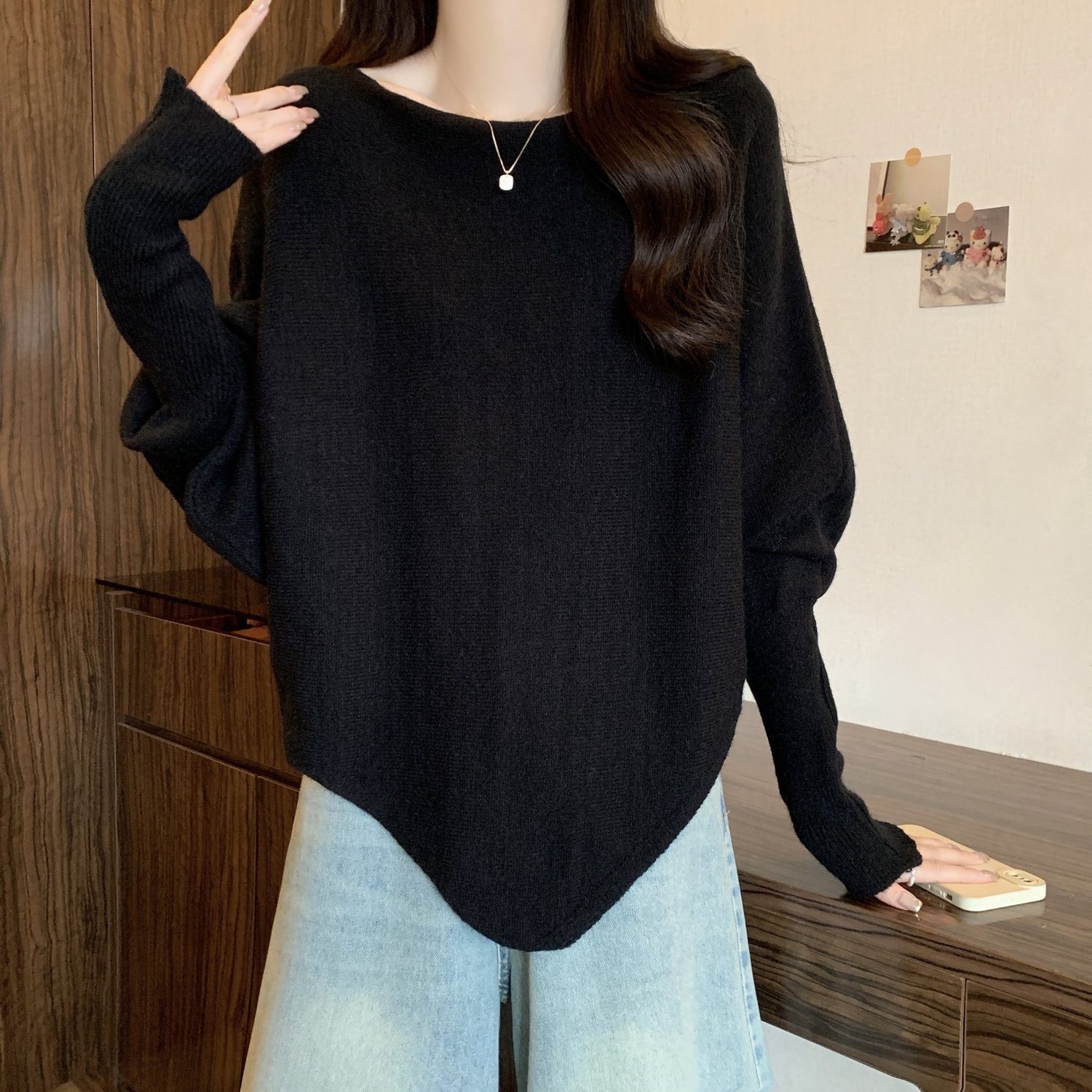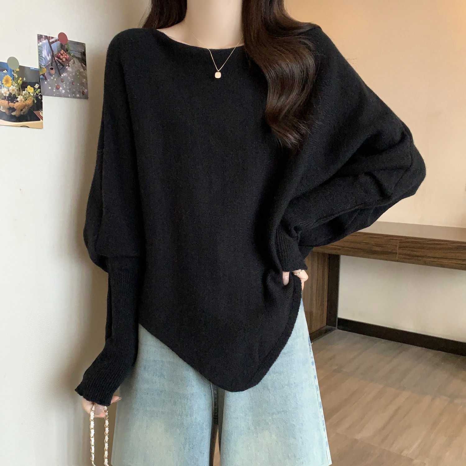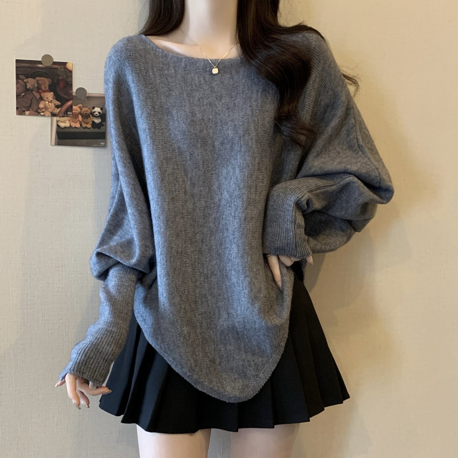 高级感格雷系穿搭灰色针织衫毛衣女秋装大码胖mm不规则蝙蝠袖上衣