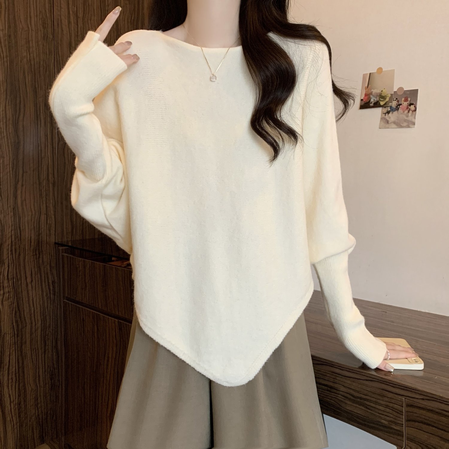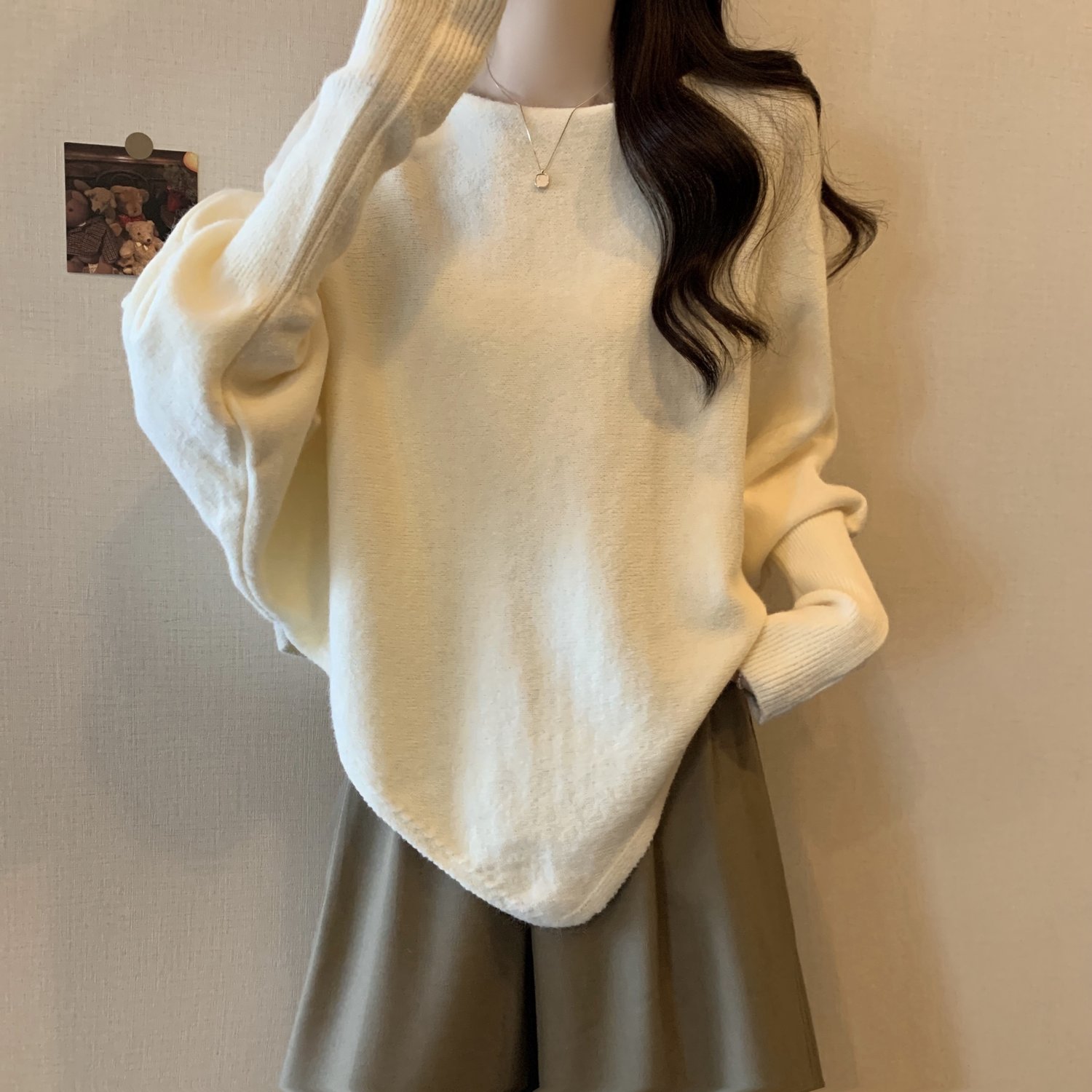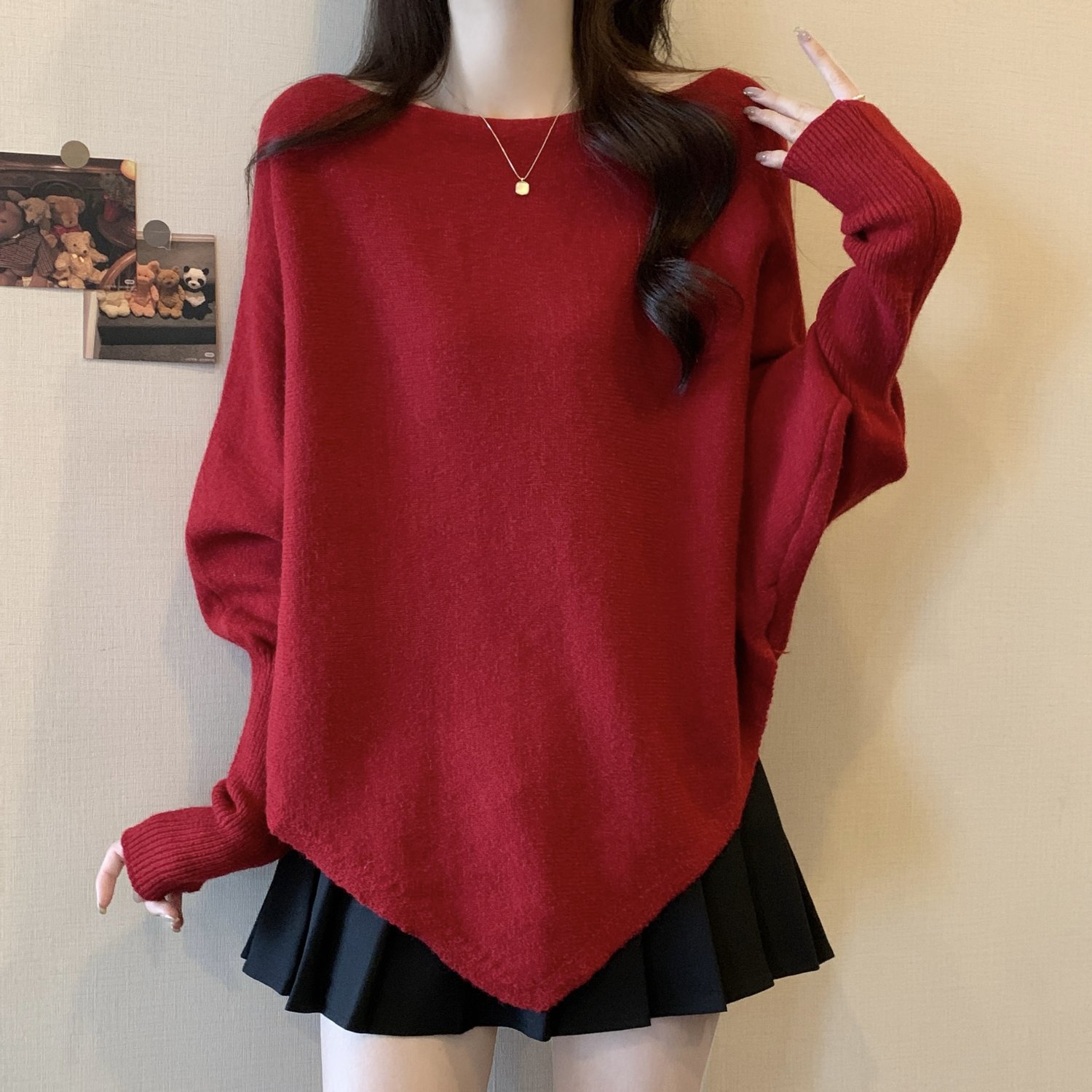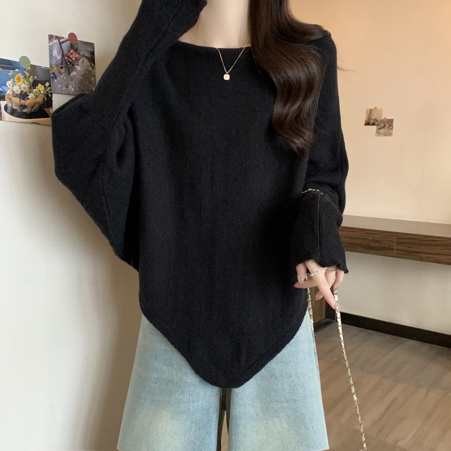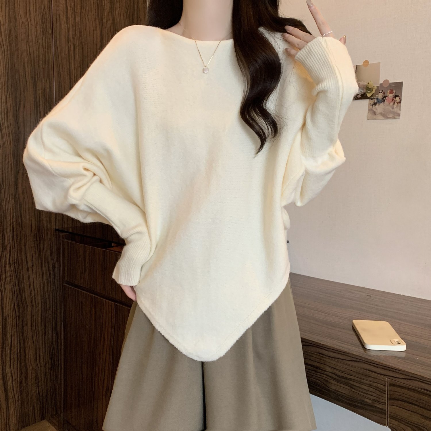 高级感格雷系穿搭灰色针织衫毛衣女秋装大码胖mm不规则蝙蝠袖上衣