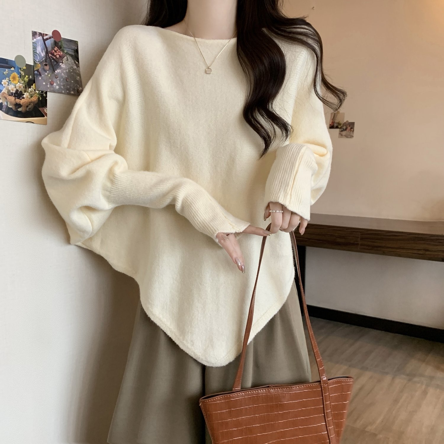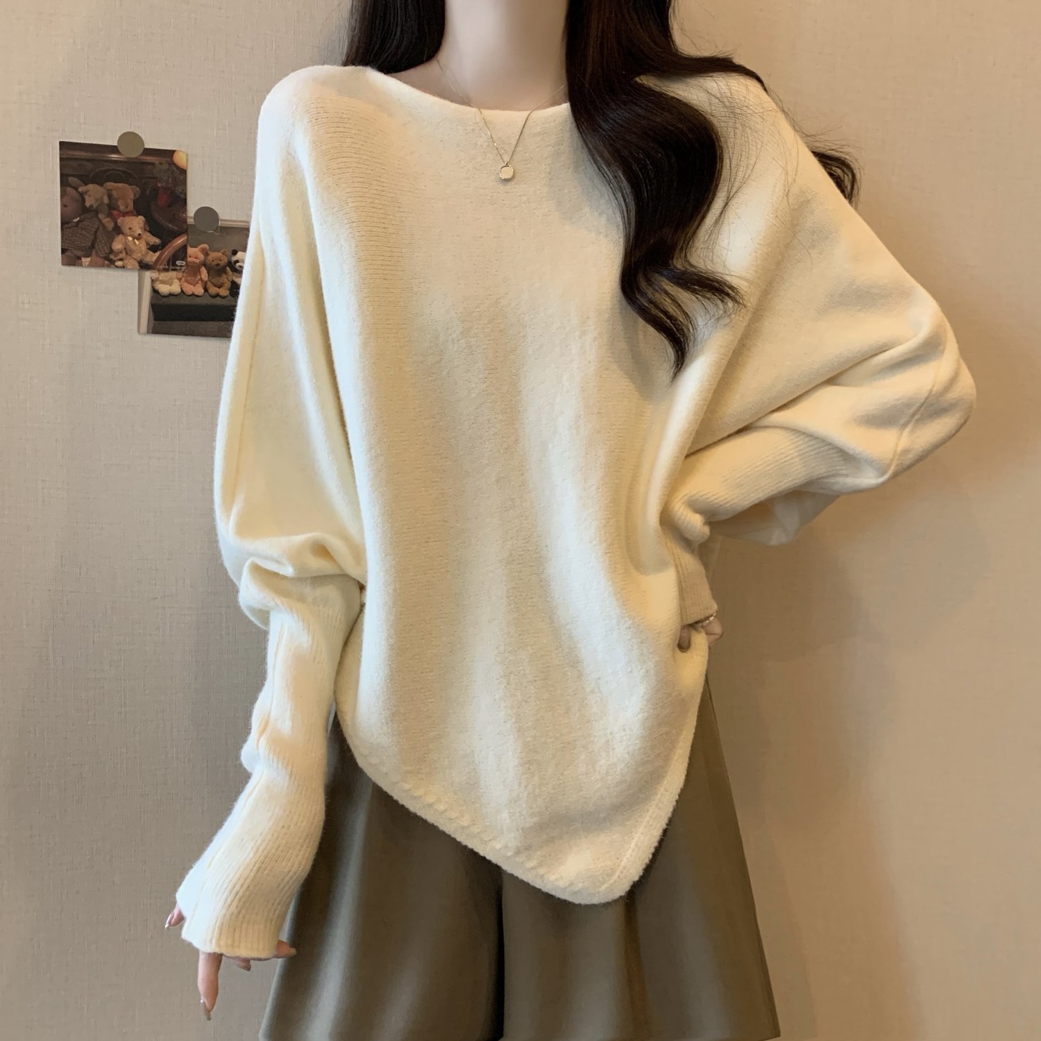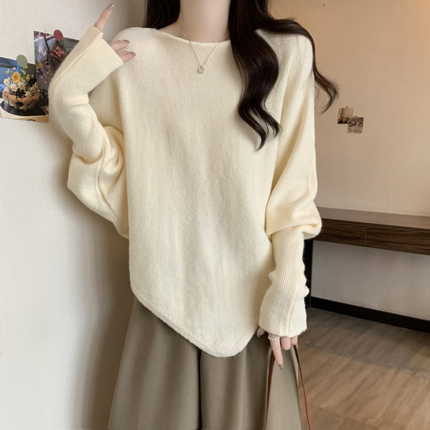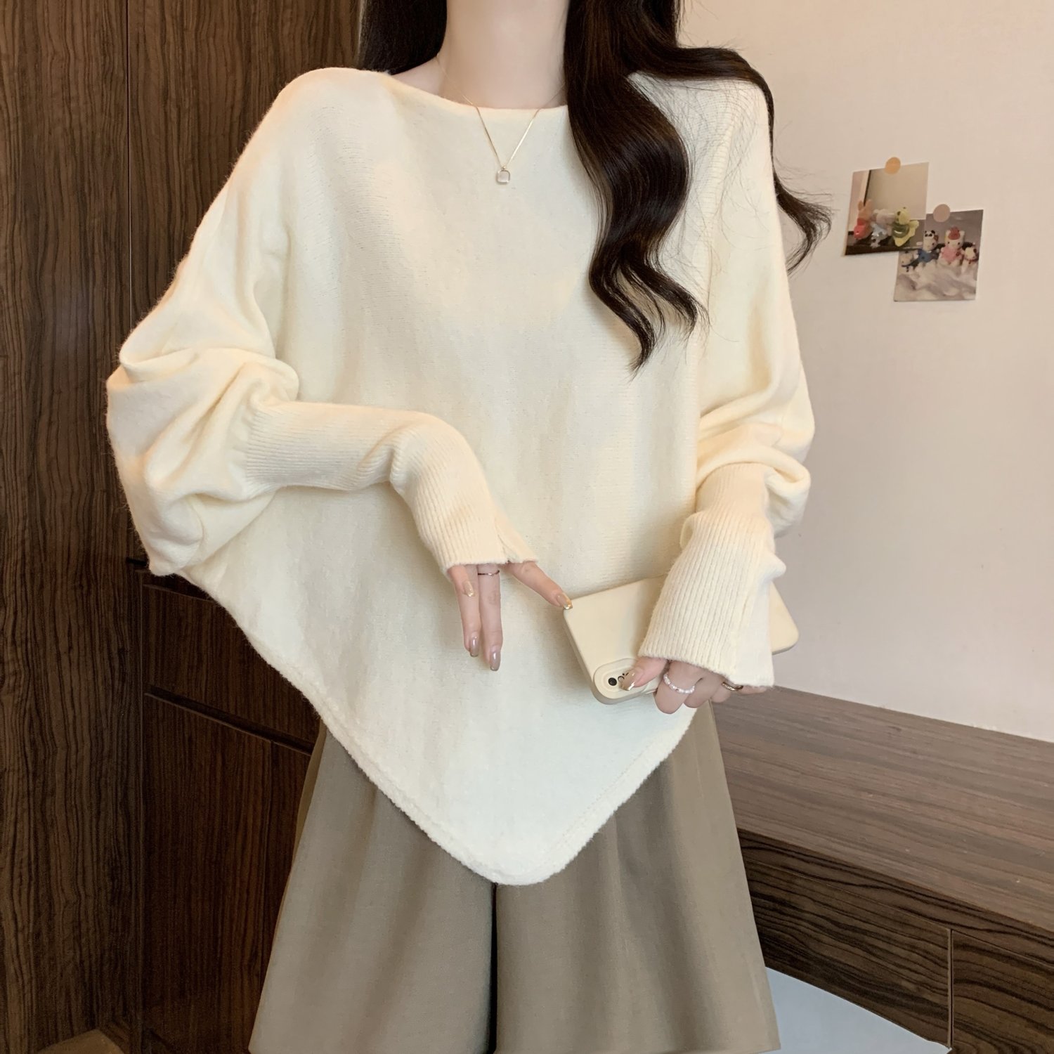 高级感格雷系穿搭灰色针织衫毛衣女秋装大码胖mm不规则蝙蝠袖上衣