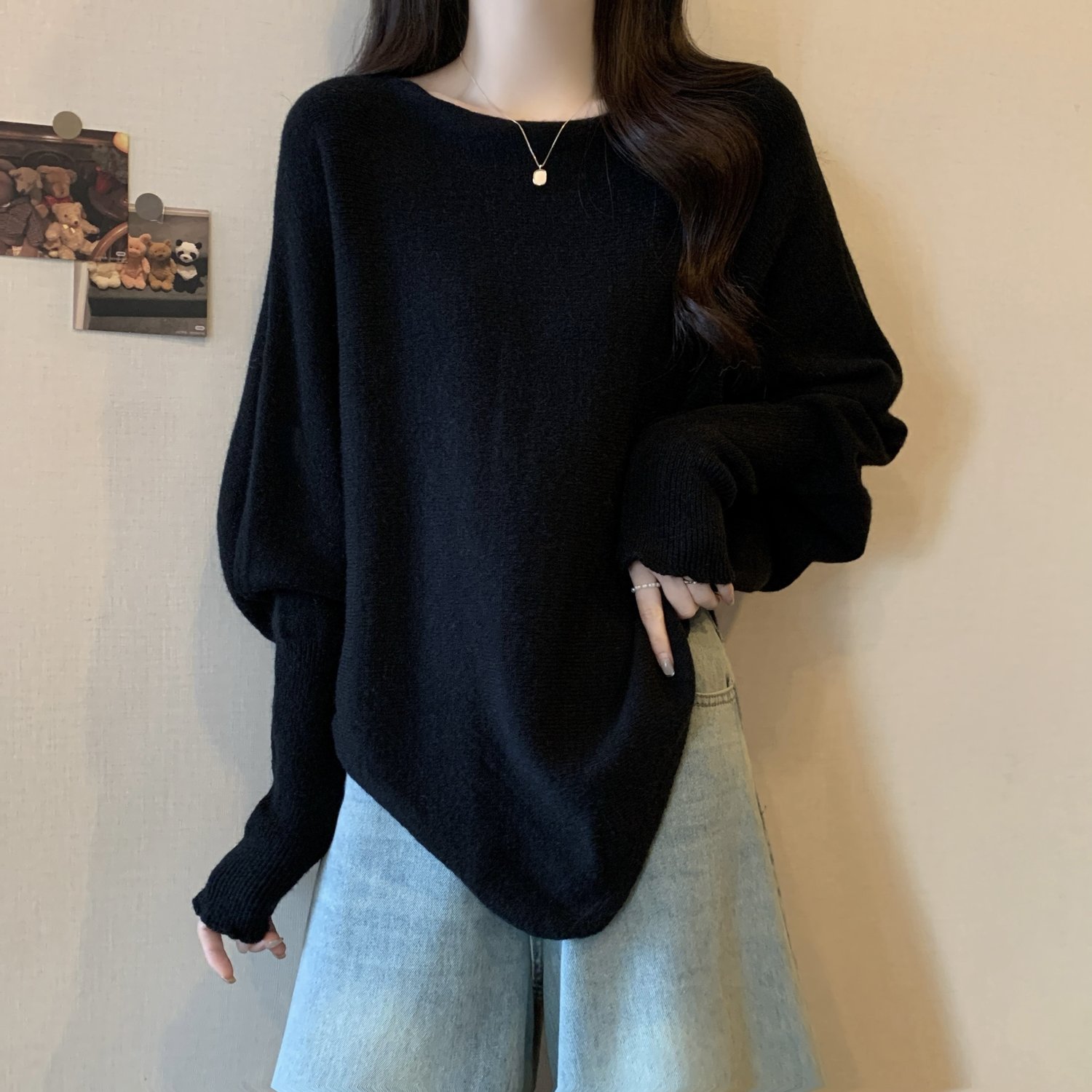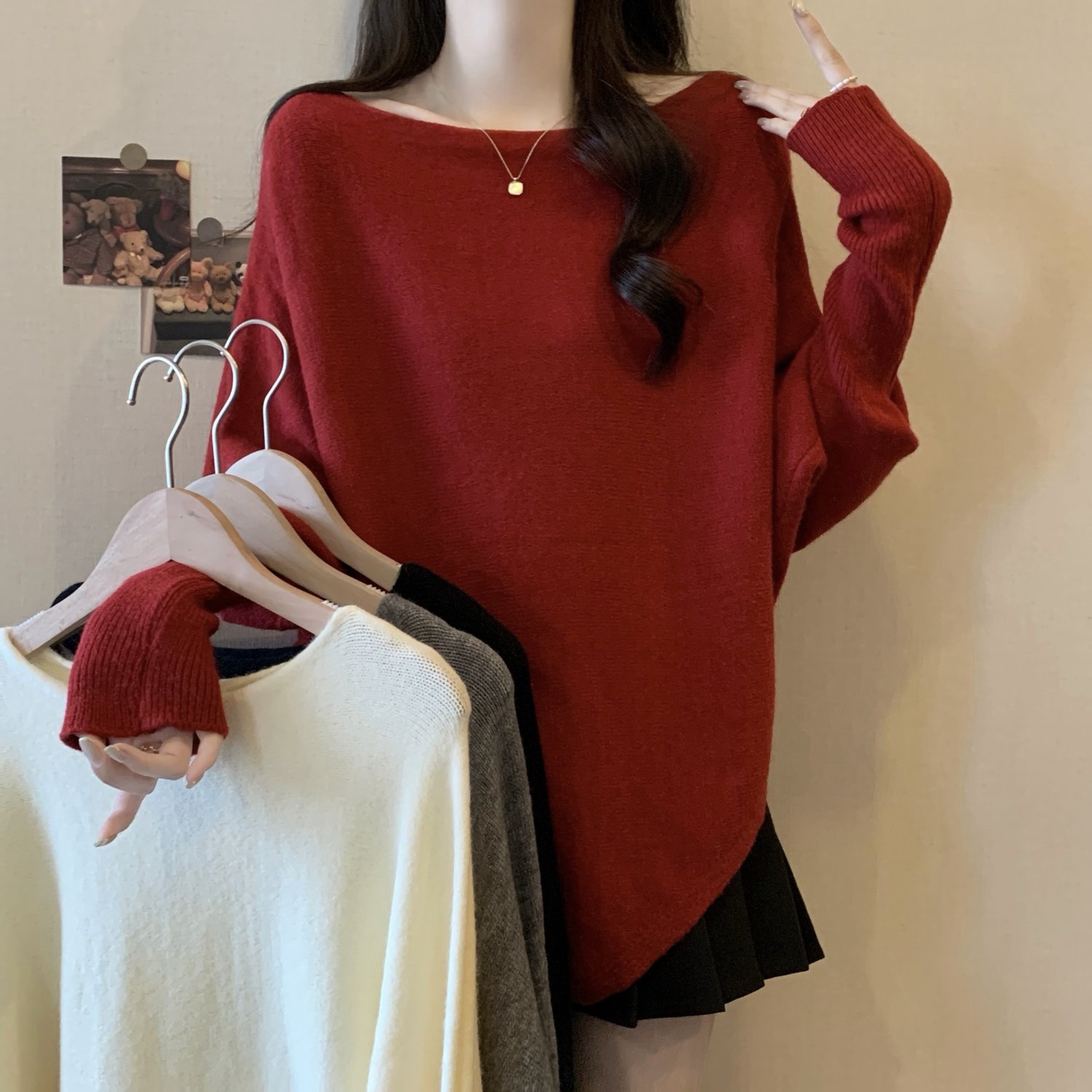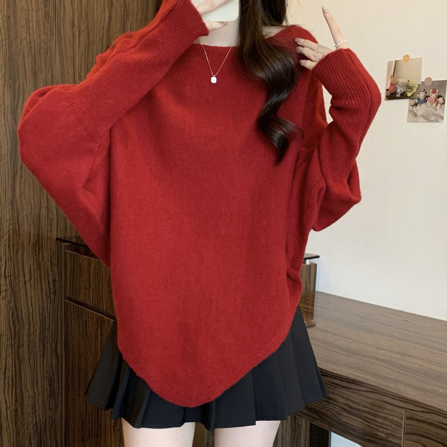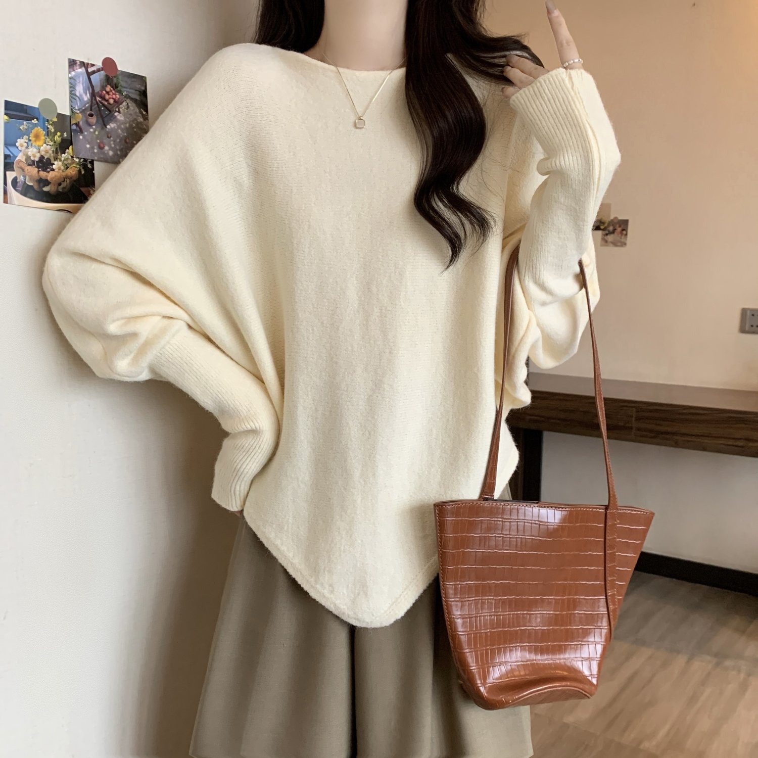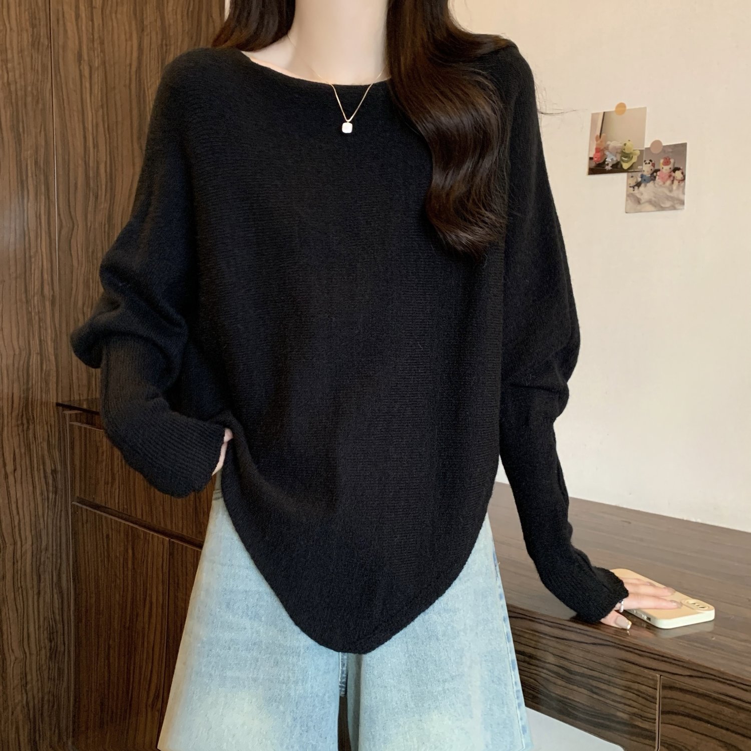 高级感格雷系穿搭灰色针织衫毛衣女秋装大码胖mm不规则蝙蝠袖上衣