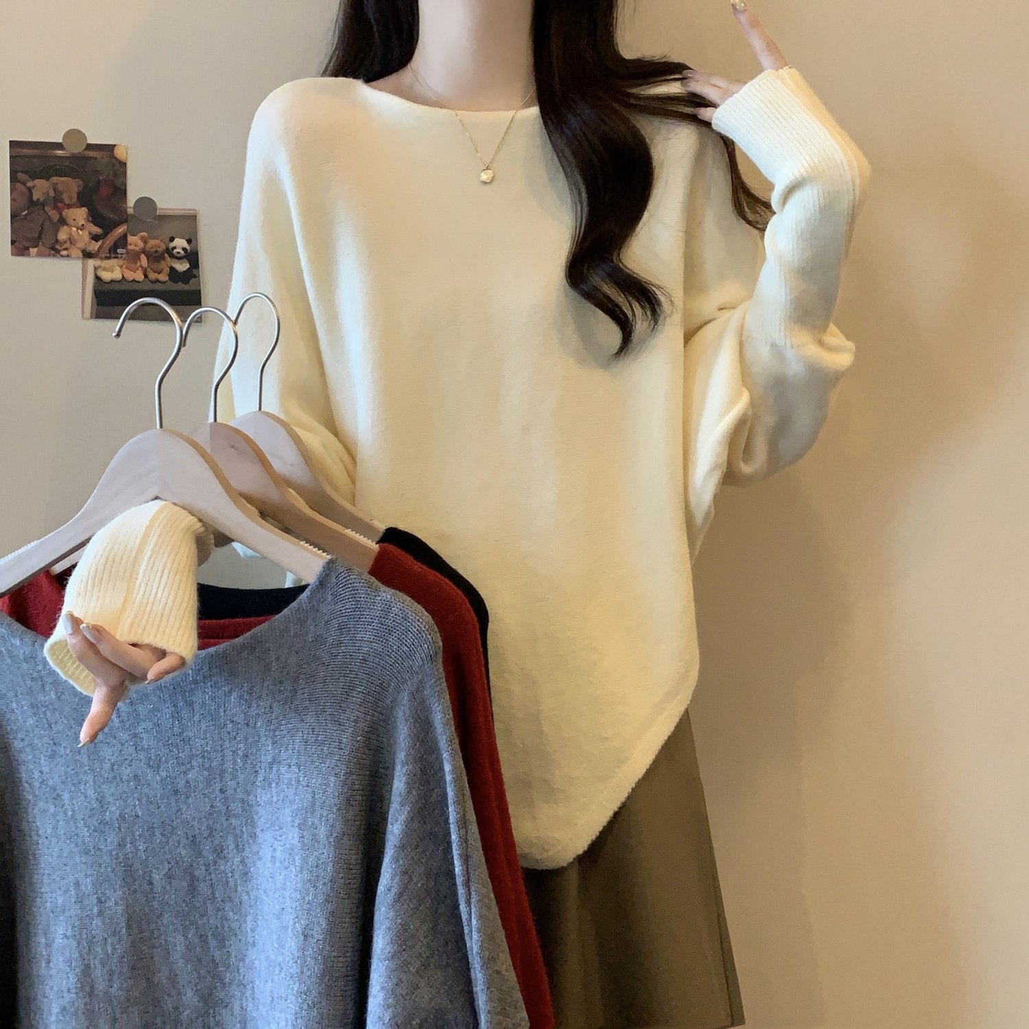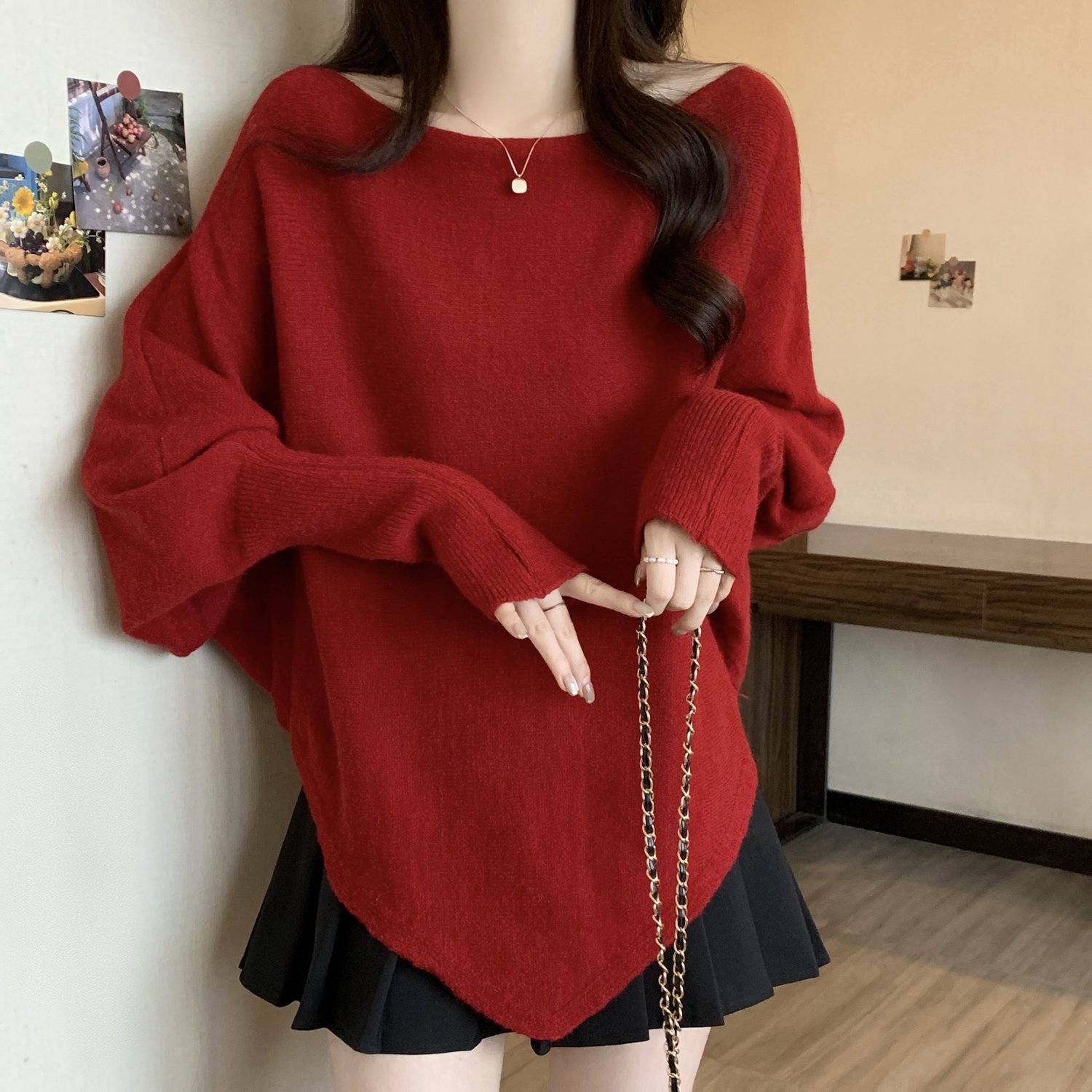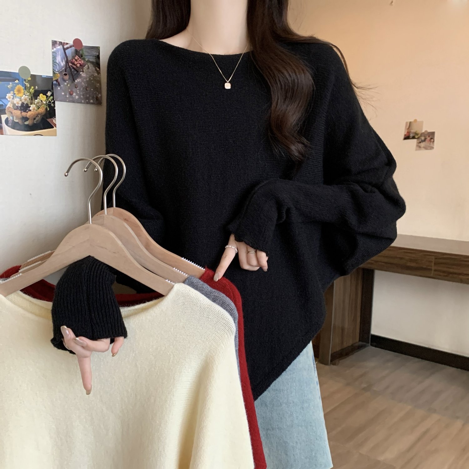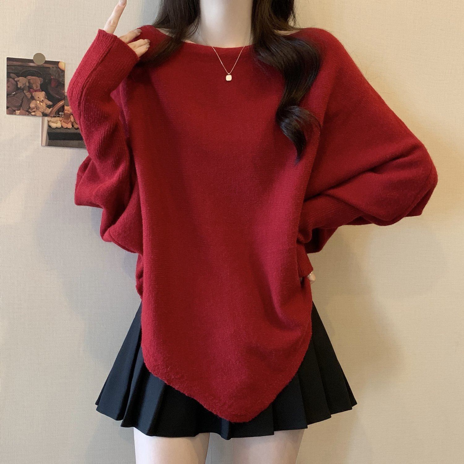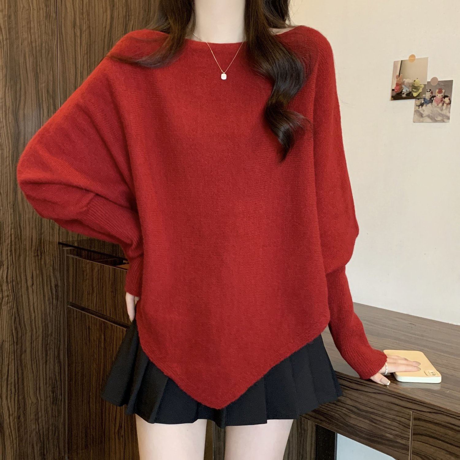 高级感格雷系穿搭灰色针织衫毛衣女秋装大码胖mm不规则蝙蝠袖上衣